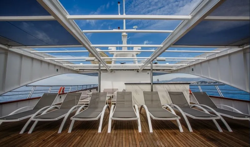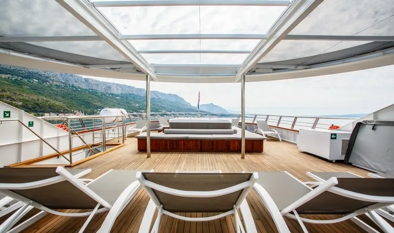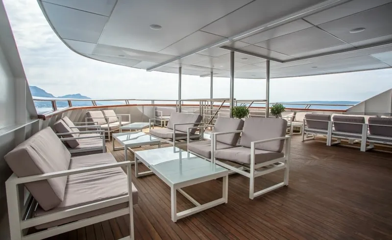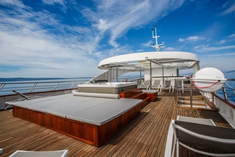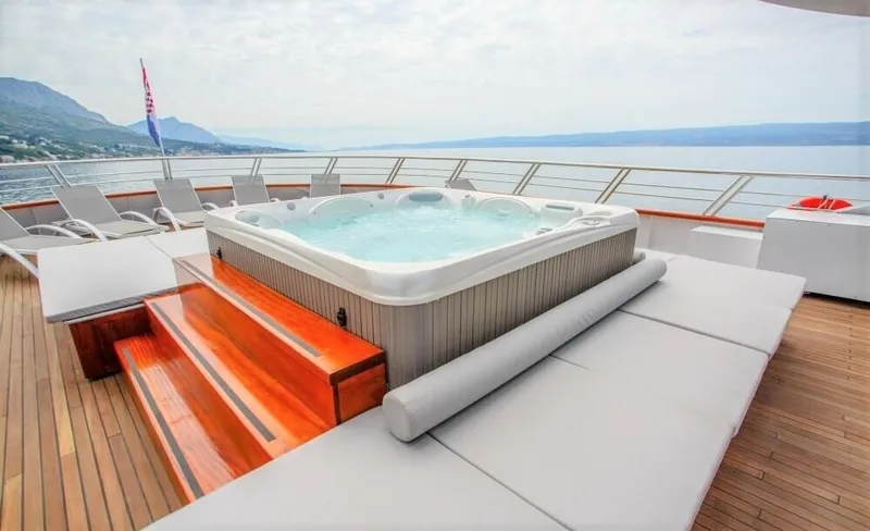 However, the outdoor areas are the yacht’s true spotlight as hardly anything matches the 300-square-meters sundeck equipped with a Jacuzzi, sun pads, sun lounges and the top-notch service of the crew.
