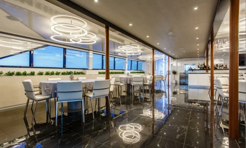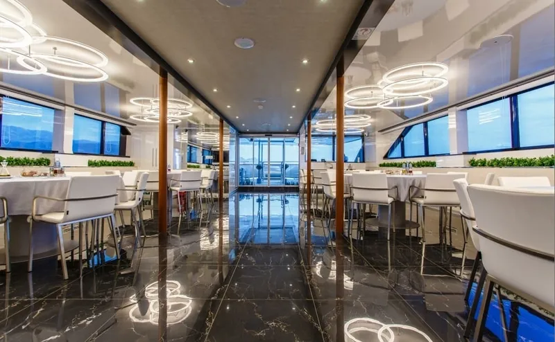 Half board or full board menus are being served in a 145-square-meters salon that features a bar and many entertainment options such as PlayStation, iPod / iPad mobile docking station, Wi-Fi, flat TV, DVD and CD player.