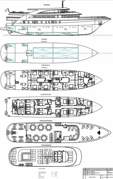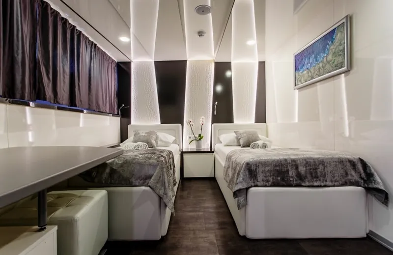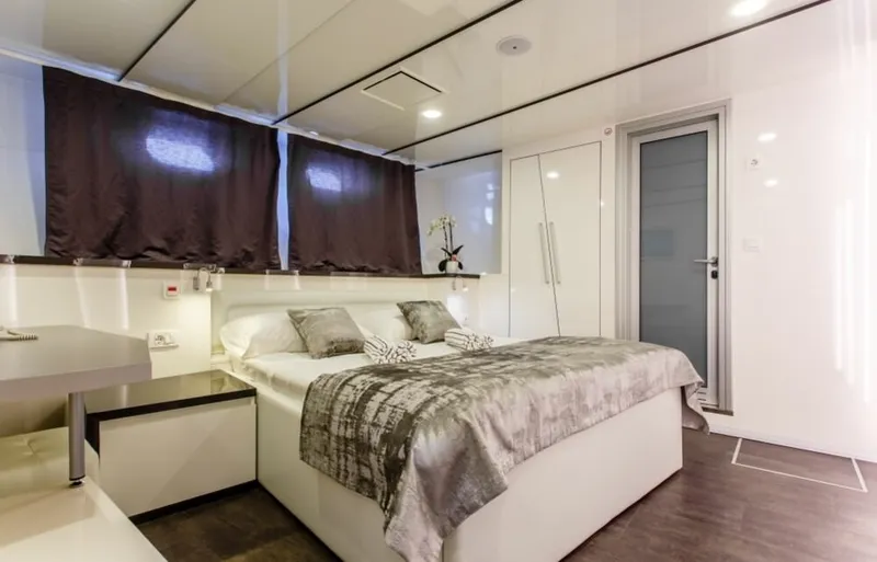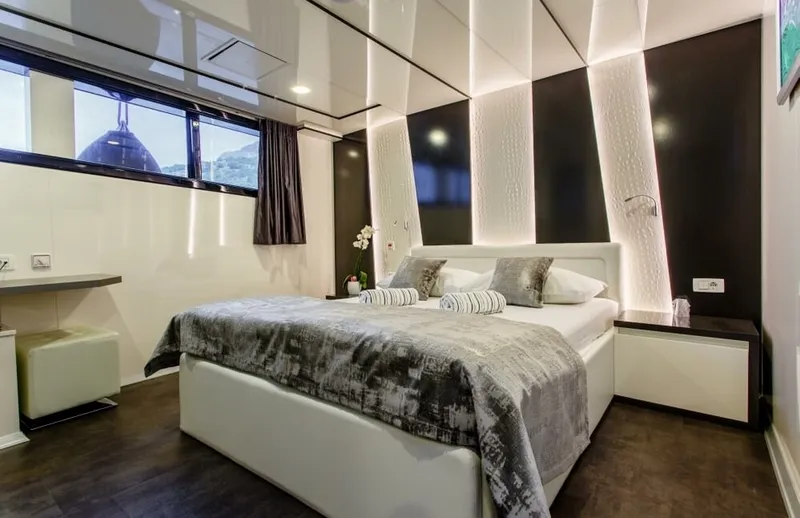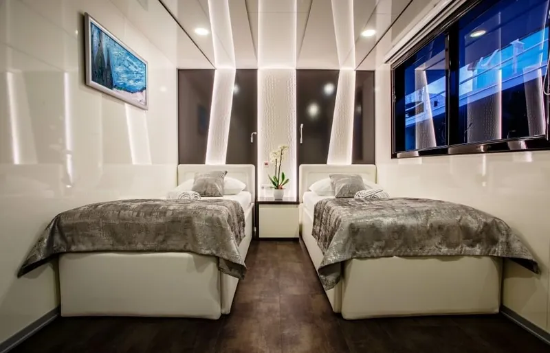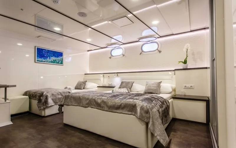 There are 14 double cabins, 3 triple cabins and one single cabin. All cabins are fully equipped with everything one might need on a luxury Mediterranean cruise including interphone, HVAC controls, air conditioning, flat TV and room service.