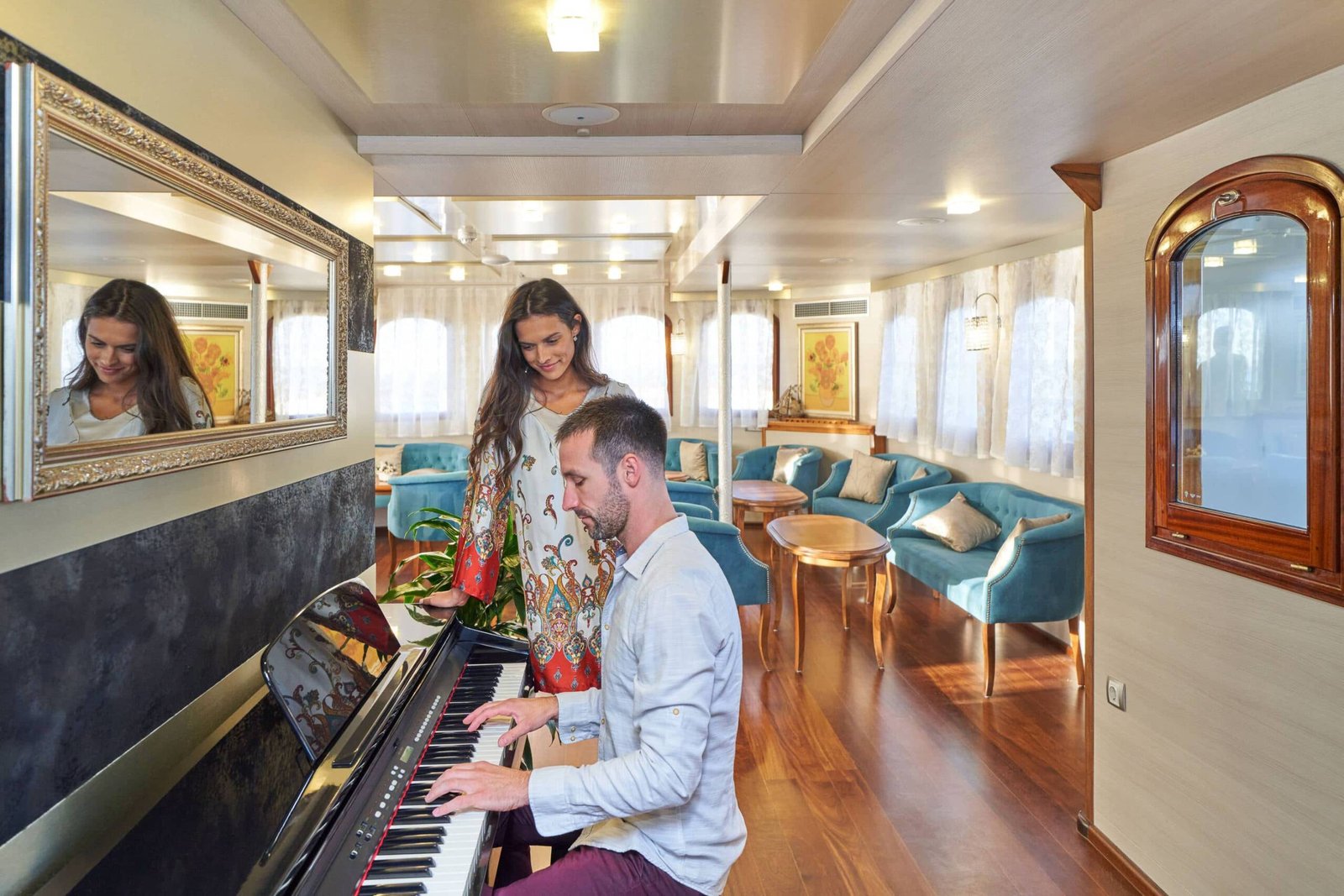 Upper deck: Salon restaurant, Terrace, Piano lounge, Salon for crew, Kitchen, Computer corner, Sun deck area