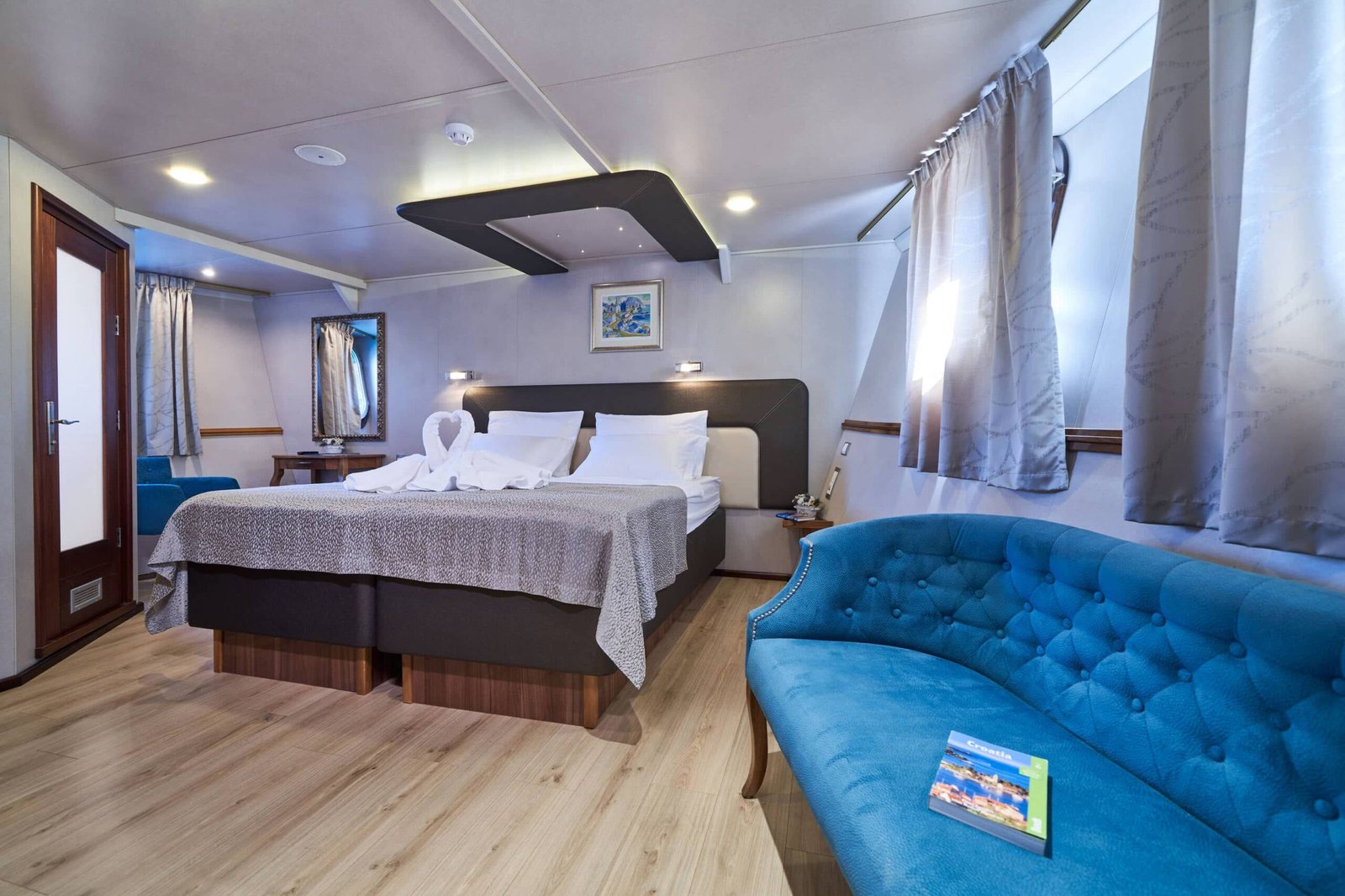 Each cabin has two twin beds (90 x 200 cm) or one double bed (180 x 200 cm), with air-conditioning, plasma TV, free wireless internet, working tables, mirror, safety deposit box, night lamps, wooden wallboards, chair, electricity supply, safety and fire alarm installations, sanitary facilities, mini bar, toilet and shower with cabin.