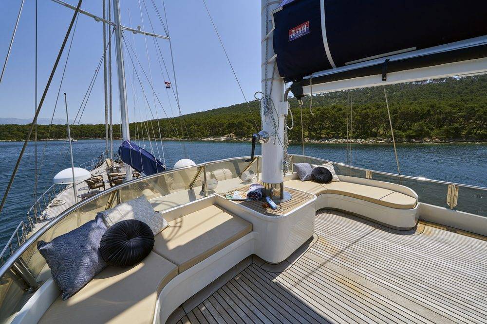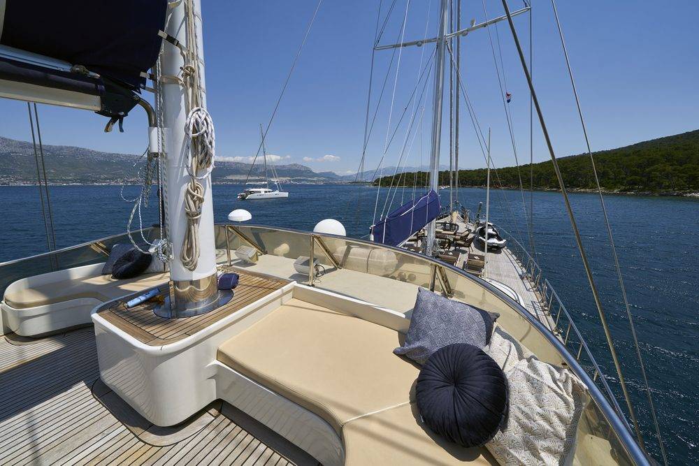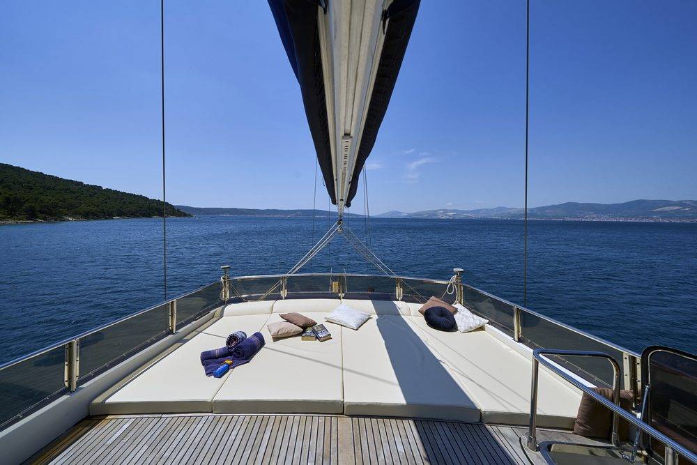 - Lounge area with cushions on the bow deck