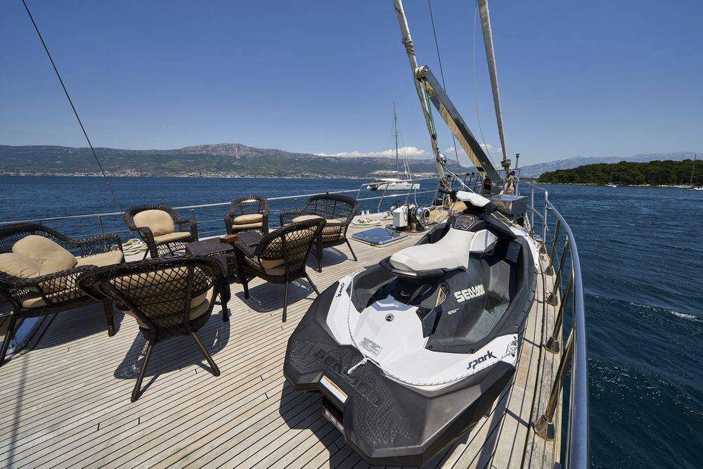 - Leisure equipment: Tender 5 m with 60 HP outboard engine, Water ski, Kayak, Stand Up Paddle, Snorkeling equipment, Wave Runner (charged extra)
