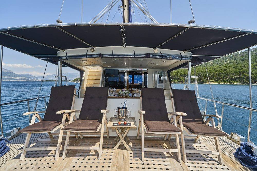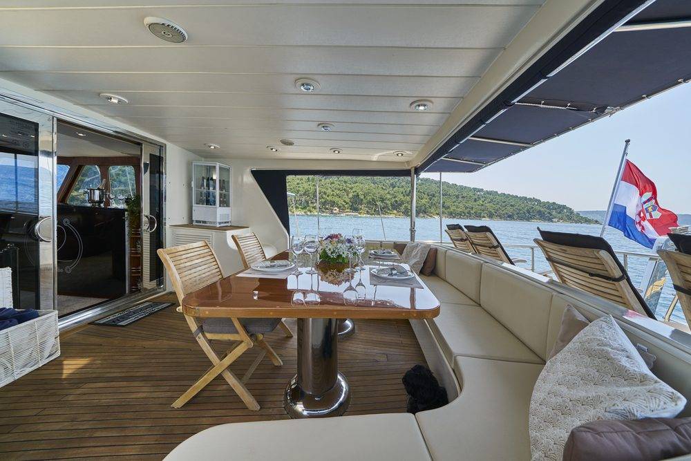 - Shaded dining area on the stern deck