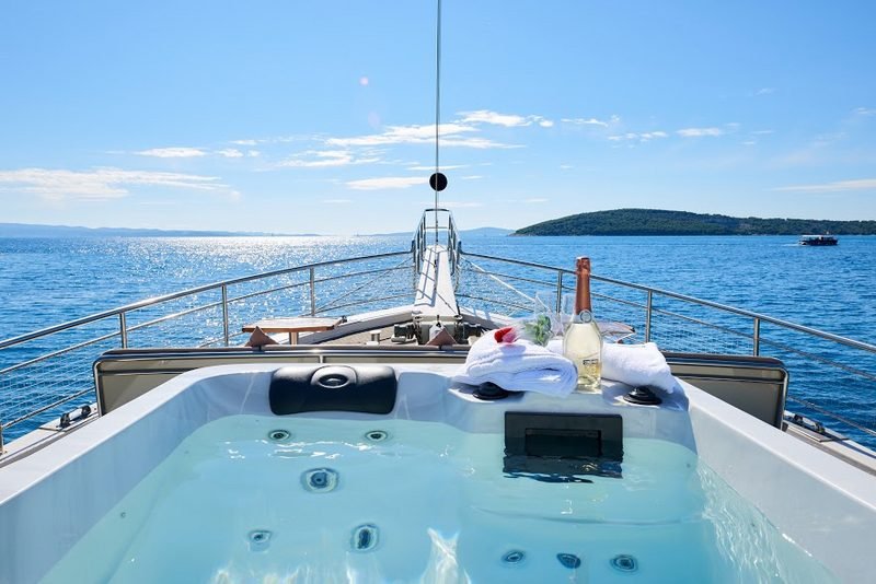 Gulet Nautilus is an elegant cruising yacht available on the charter market for private cruises in Croatia. Available from Split or Trogir, gulet Nautilus may also be rented for a one-way cruise to Dubrovnik. A total of 16 guests may be accommodated in 8 double bed cabins, each with an en suite bathroom. Nautilus has a very spacious salon that comprises a dining area and a TV, perfect for those seeking escape from the sun. Ample salon extends out to the generous exterior spaces that offer multiple lounging and dining areas. A large sunbathing area is located on the front deck with brand new sun mattresses, partially shielded from the sun so you can enjoy both the sun and the shade when needed. The aft deck features an outdoor dining table that sits comfortably up to 16 persons and can be adapted according to the number of guests. Another sitting area is located on the front deck, intended for casual dining and relaxing under the shade. For those who pursue a dynamic holiday, plenty of water sports equipment will keep everyone aboard entertained. There are two kayaks, two paddle boards, donut, wakeboard and water skis. In addition to recreational activities, the guests can also relish delicious local meals provided by the chef on board. Since the gastronomic offer plays such an important role on this unique cruise, the guests can choose between half board and full board menus, tailoring their holiday precisely to their needs. Another advantage of chartering gulet Nautilus lies in the fact that it is a family run business, which means that it is in their best interest that everything goes smoothly on your cruise. This is also reflected in the great charter service provided by the gulet’s crew of four. If you like water sports, good food and efficient service, you will enjoy cruising aboard gulet Nautilus.