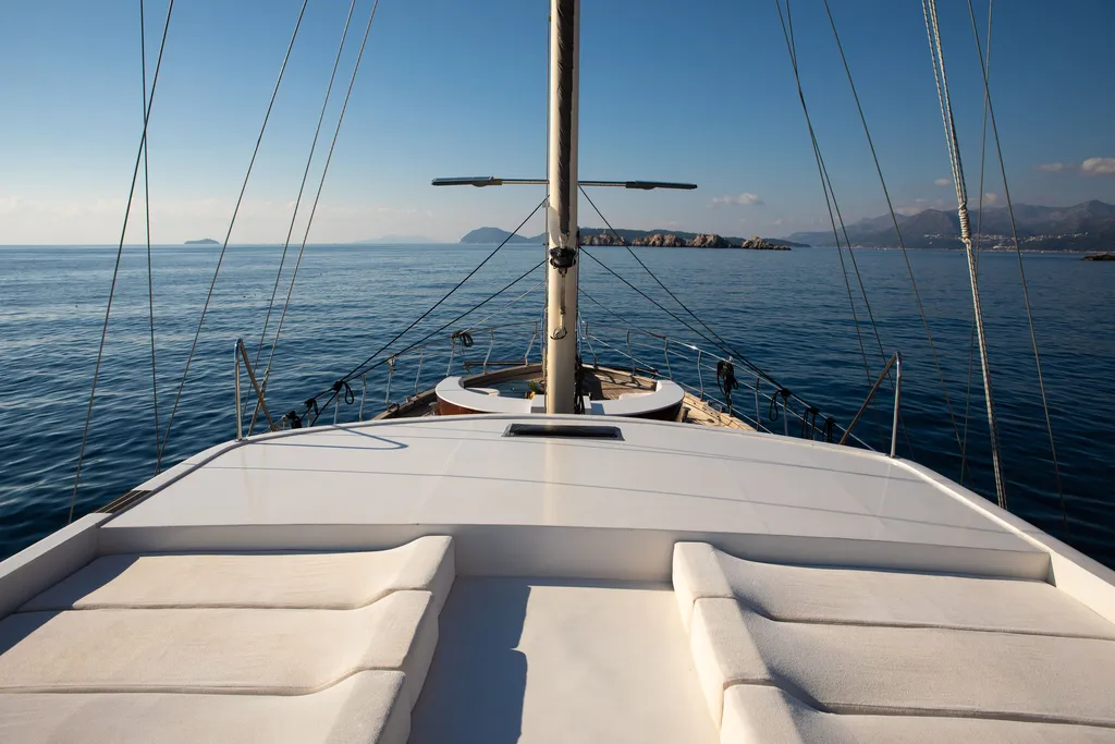 Most guests will probably spend the majority of their charter days outside though. Al fresco meals are served in a beautiful dining area on the aft deck where there is another LED TV and a bar too. After having tasted delicious Mediterranean meals, you can frolic in the sun on comfortable day beds on the sun deck or you can disembark to explore stunning Dalmatian islands and ancient coastal towns dotting the Adriatic coast.