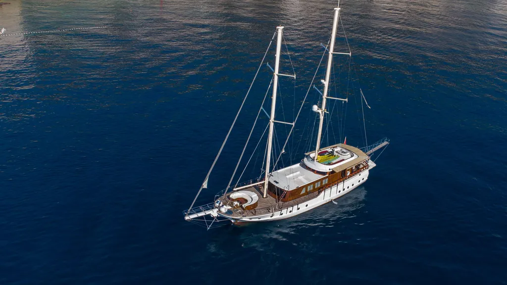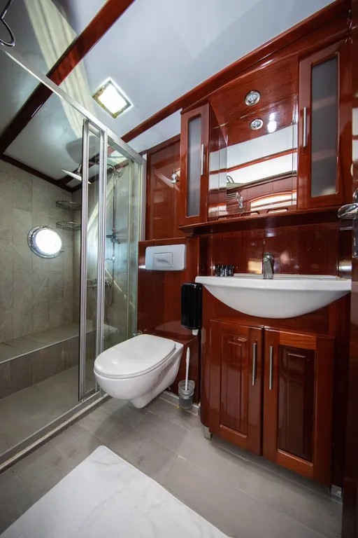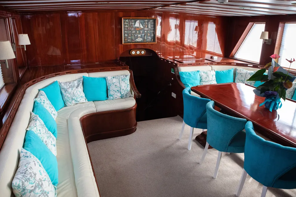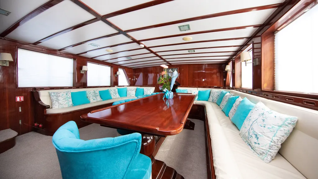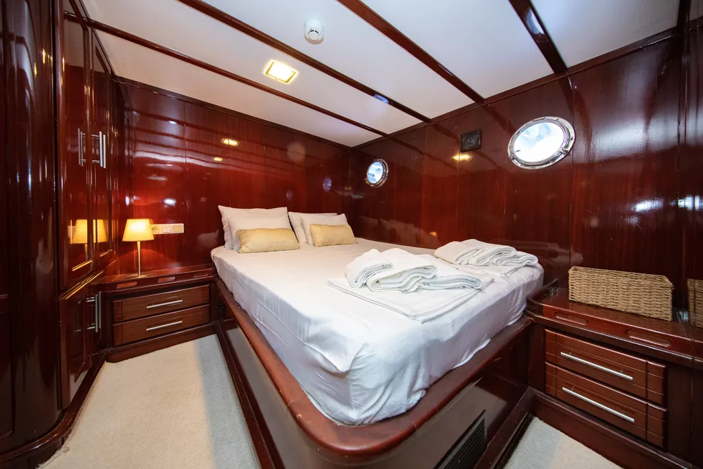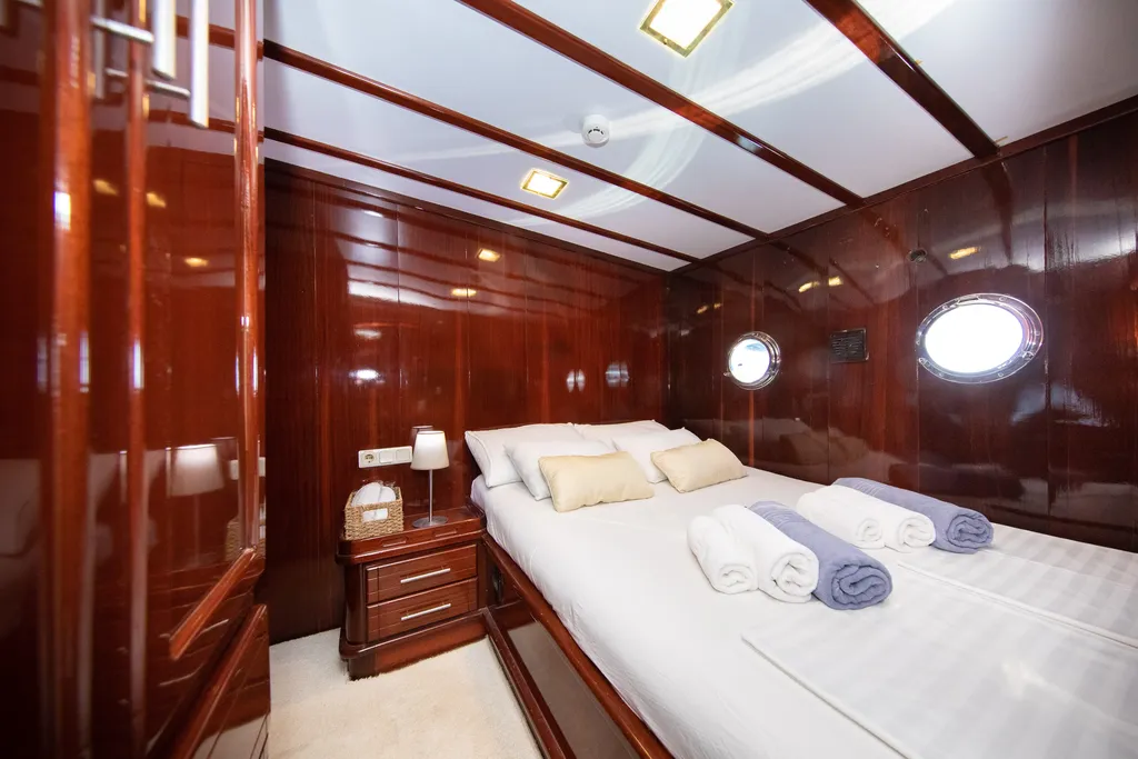 There are 5 double bed cabins and 1 master cabin, allowing charter groups of up to 12 guests to be comfortably accommodated aboard. Decorated in polished mahogany wood, cabins are air conditioned and have en suite bathrooms.