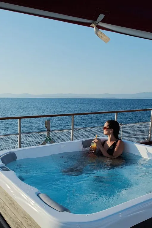 • Il ponte superiore offre materassini prendisole, un divano e una vasca idromassaggio Jacuzzi per un relax totale.