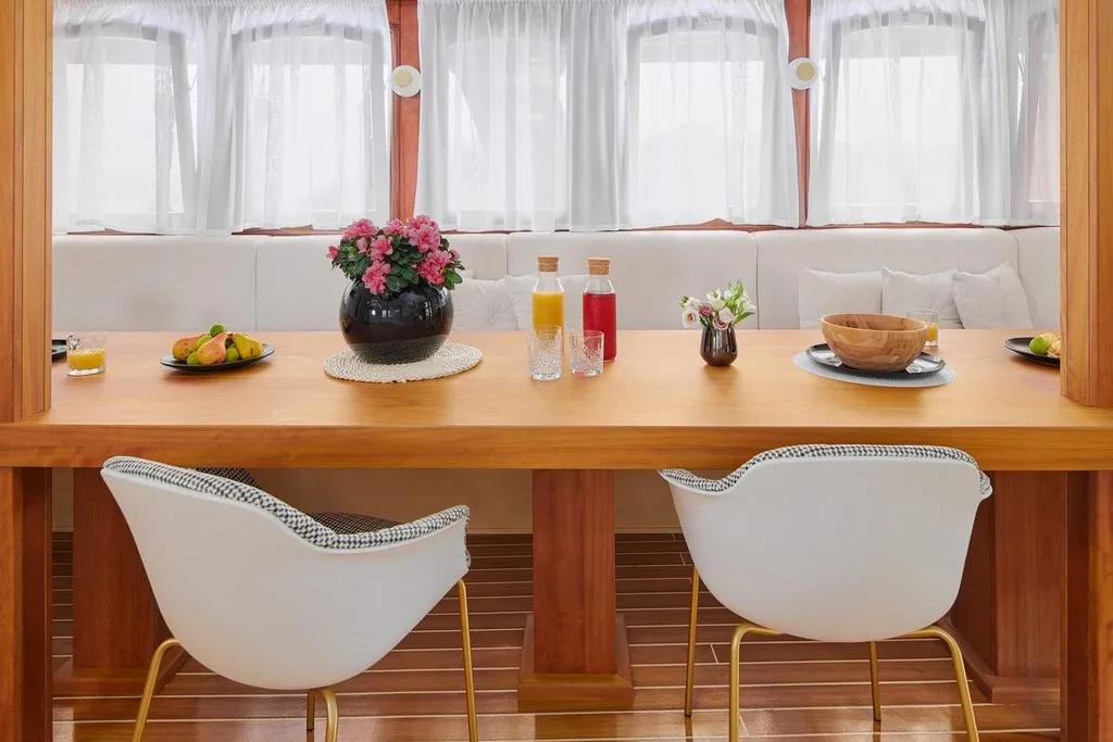 • Il ponte di poppa dispone di un hard top che offre una perfetta zona d’ombra, una comoda piattaforma imbottita e una splendida zona pranzo all’aperto