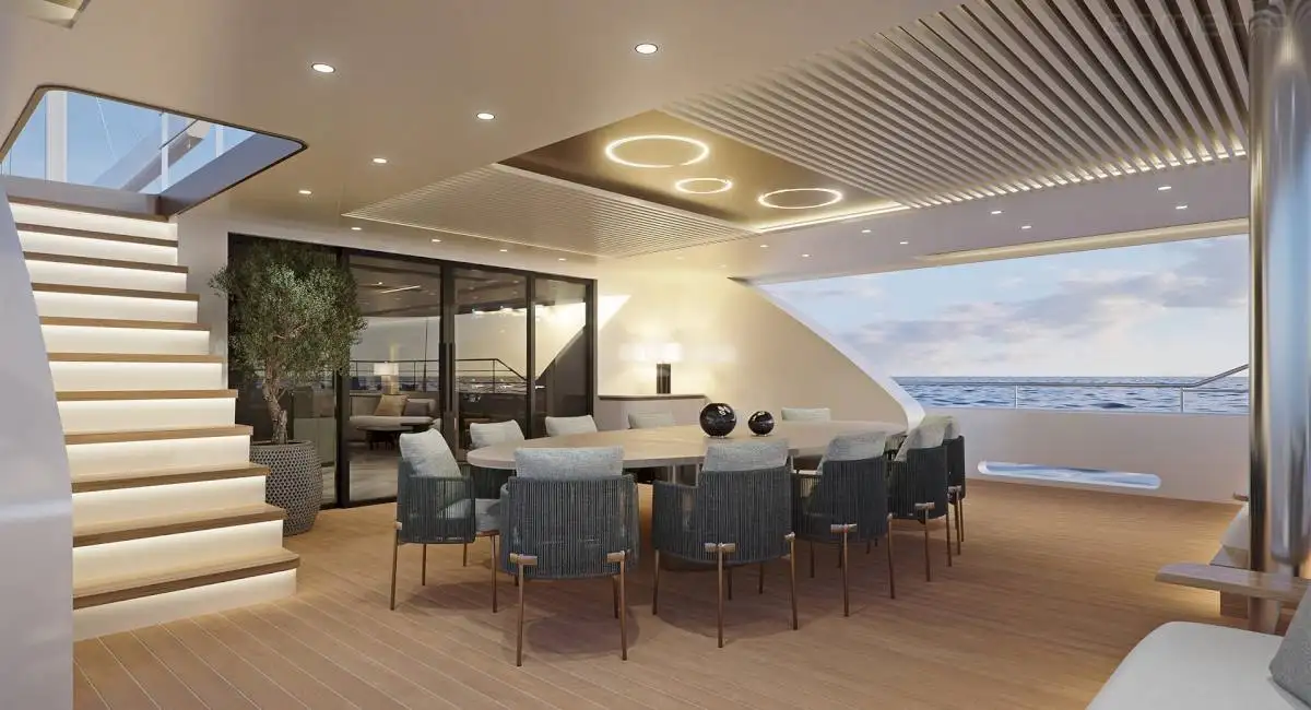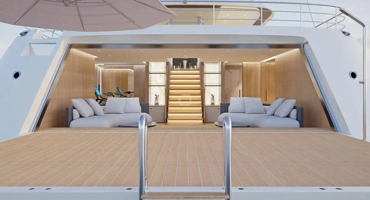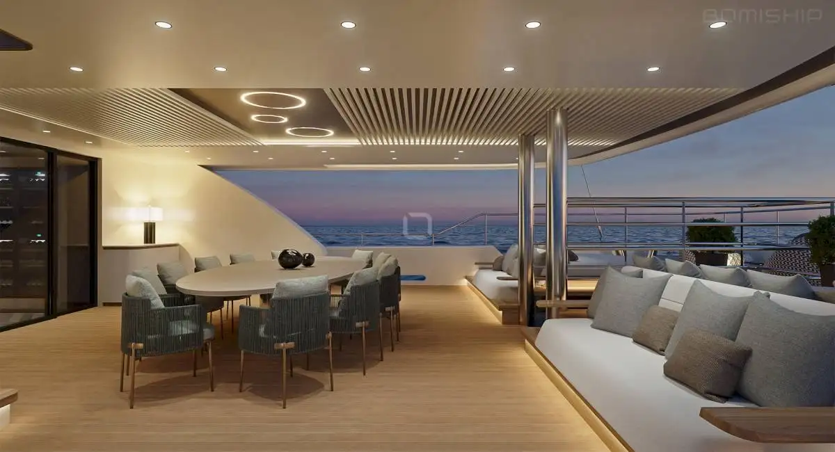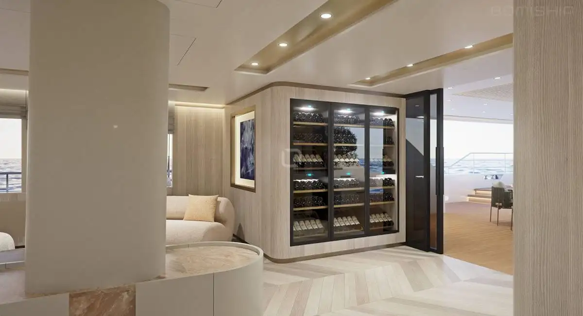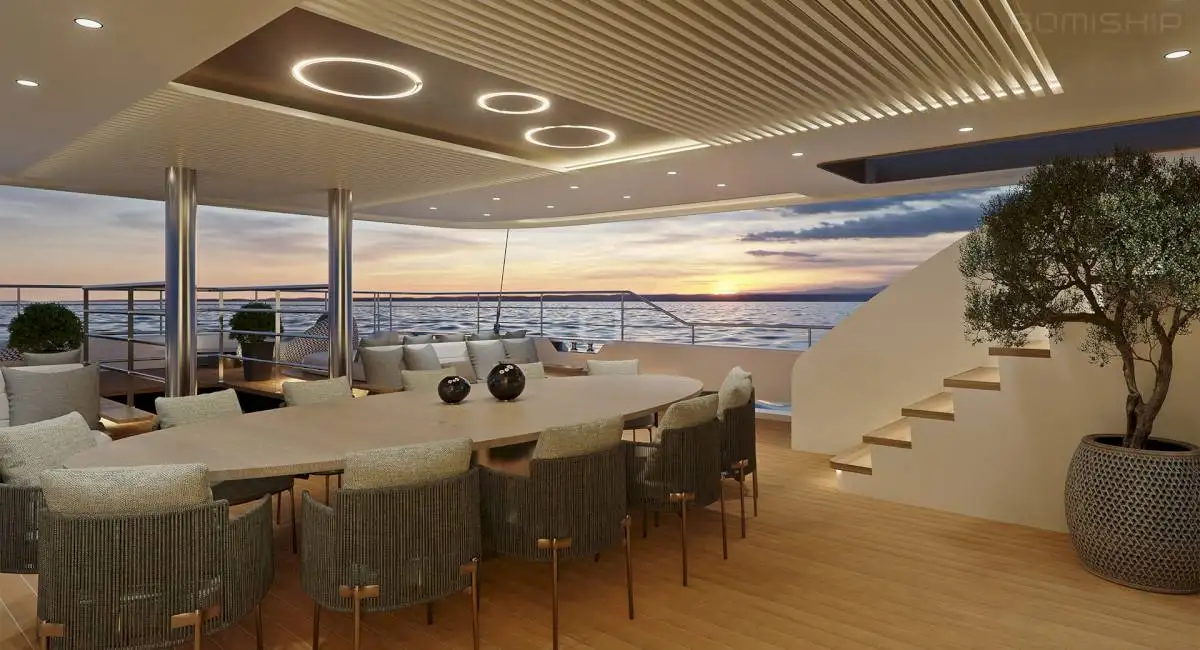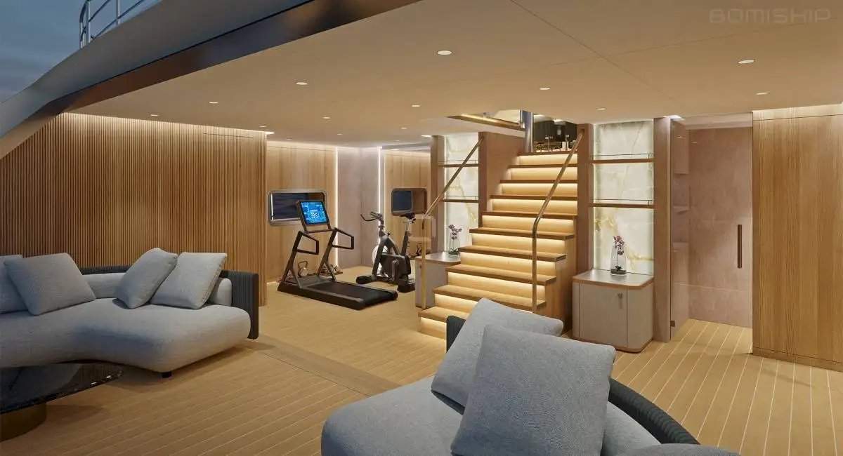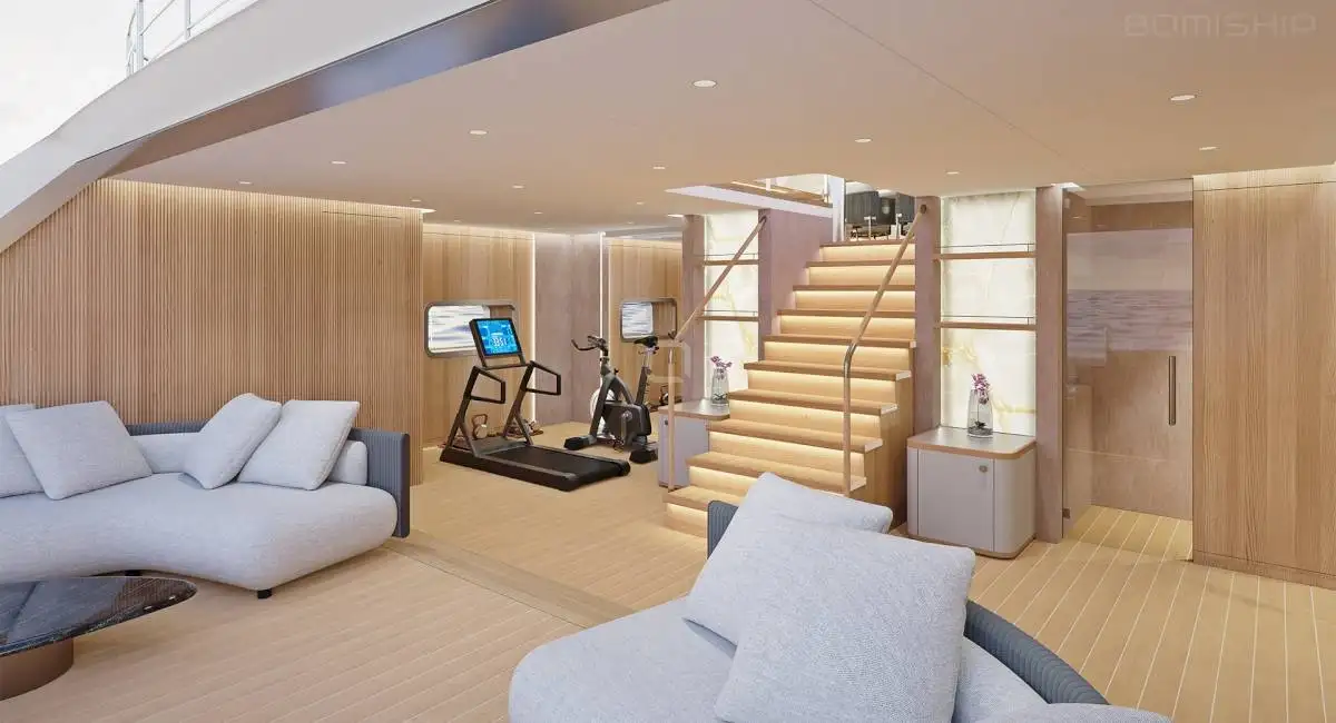 Beach club con sauna finlandese, palestra, ampia piattaforma bagno 20 m², ponti in teak, generatori Kohler 2 x 85 kW e generatore Kohler 1 x 50 kW, aria condizionata, dissalatore Duplex 2 x 300 L/h, tendalini su tutti i ponti, ampia piattaforma prendisole con doccia 20 m², Jacuzzi per sei persone, fabbricatori di ghiaccio x3, cantinette vino nel salone, wet bar, luci d’atmosfera, luci subacquee, proiettore esterno per serate cinema sotto le stelle, aree lounge prendisole.