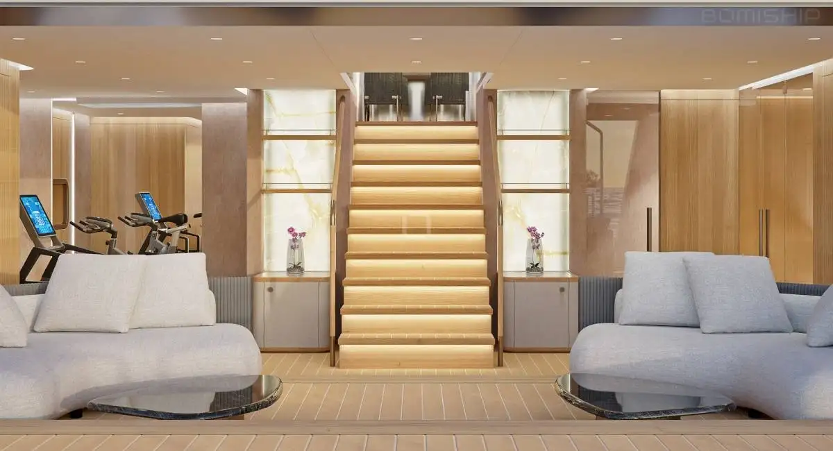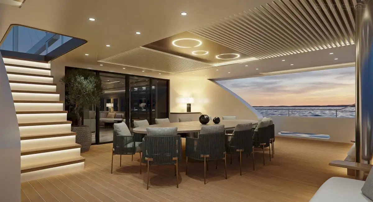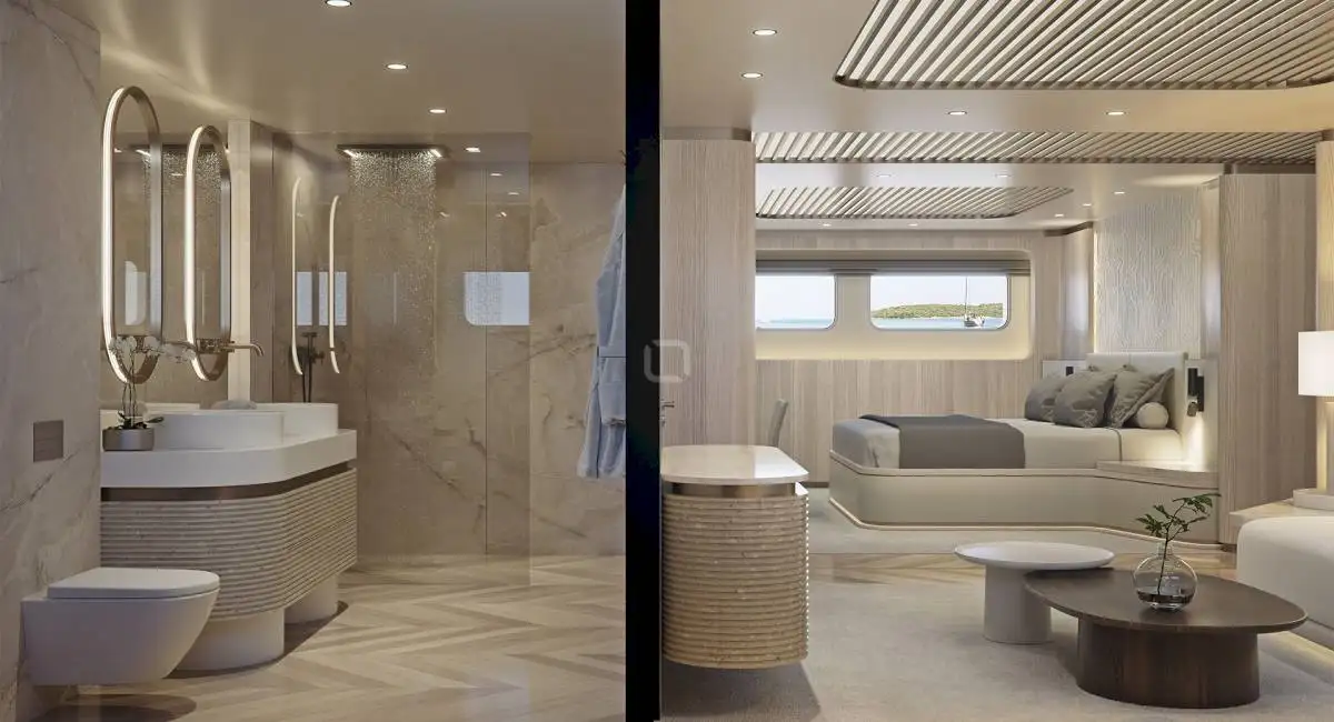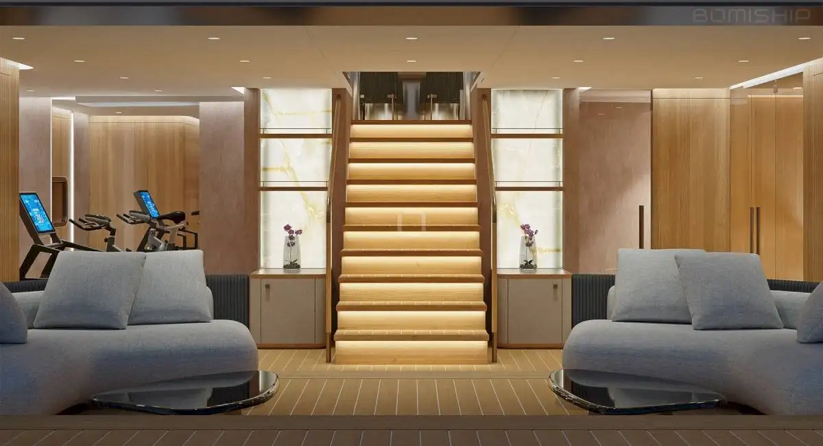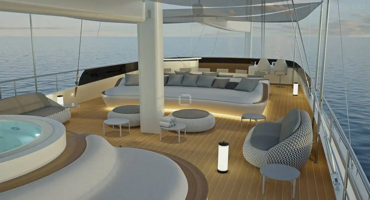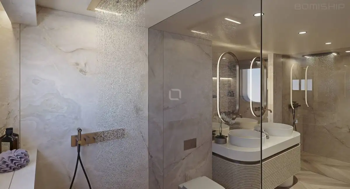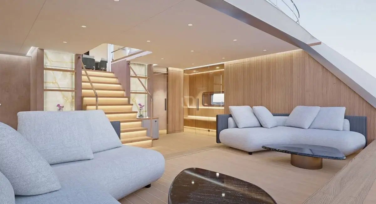 Beach club con sauna finlandese, palestra, ampia piattaforma bagno 20 m², ponti in teak, generatori Kohler 2 x 85 kW e generatore Kohler 1 x 50 kW, aria condizionata, dissalatore Duplex 2 x 300 L/h, tendalini su tutti i ponti, ampia piattaforma prendisole con doccia 20 m², Jacuzzi per sei persone, fabbricatori di ghiaccio x3, cantinette vino nel salone, wet bar, luci d’atmosfera, luci subacquee, proiettore esterno per serate cinema sotto le stelle, aree lounge prendisole.