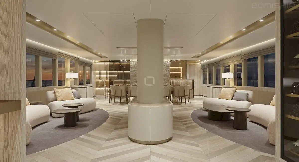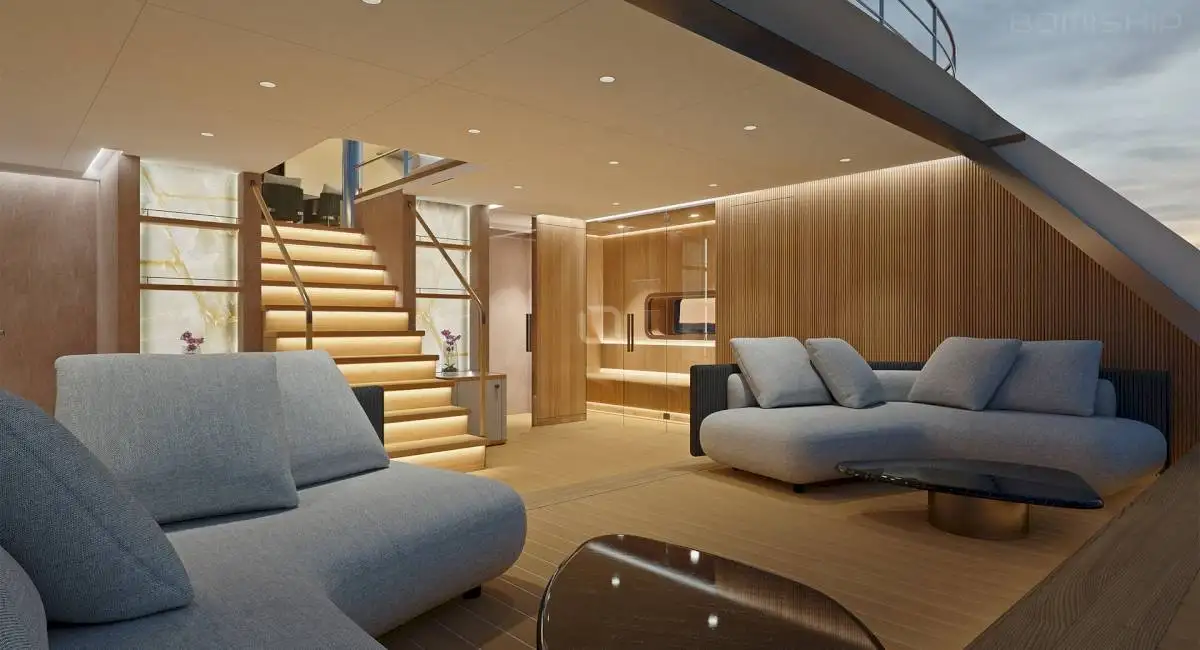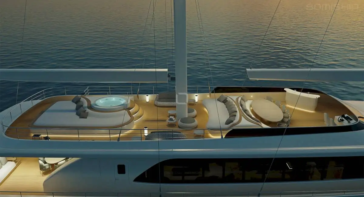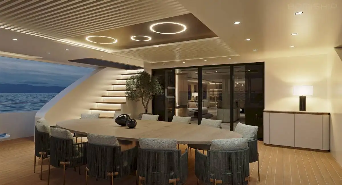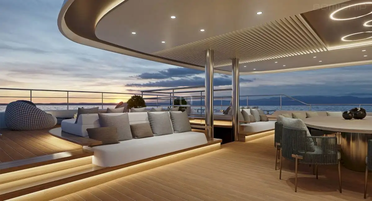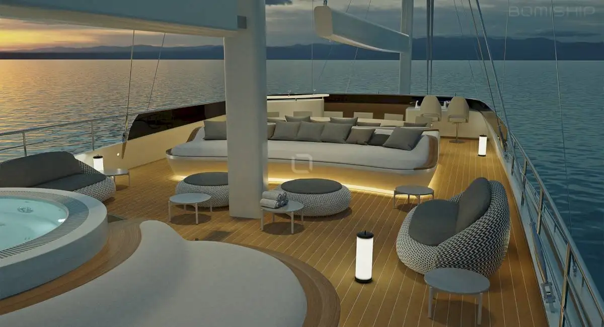 Beach club con sauna finlandese, palestra, ampia piattaforma bagno 20 m², ponti in teak, generatori Kohler 2 x 85 kW e generatore Kohler 1 x 50 kW, aria condizionata, dissalatore Duplex 2 x 300 L/h, tendalini su tutti i ponti, ampia piattaforma prendisole con doccia 20 m², Jacuzzi per sei persone, fabbricatori di ghiaccio x3, cantinette vino nel salone, wet bar, luci d’atmosfera, luci subacquee, proiettore esterno per serate cinema sotto le stelle, aree lounge prendisole.