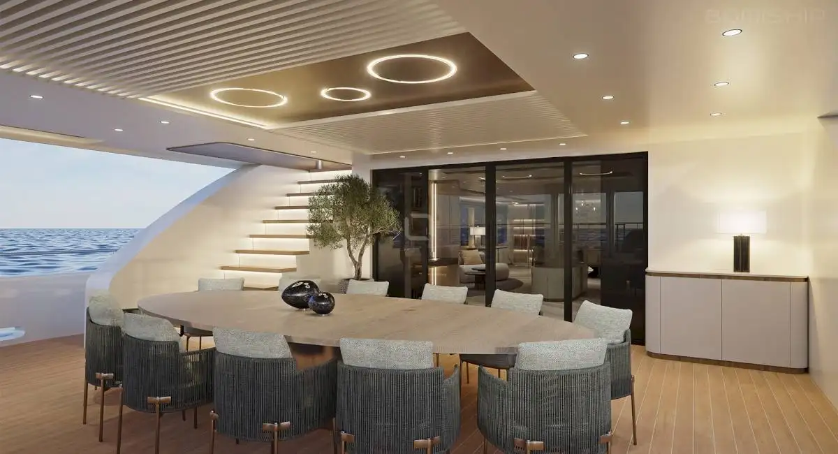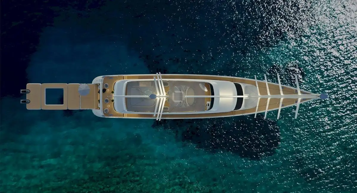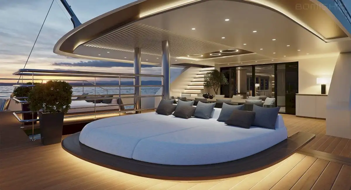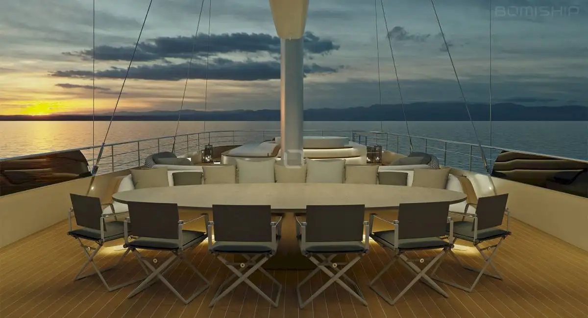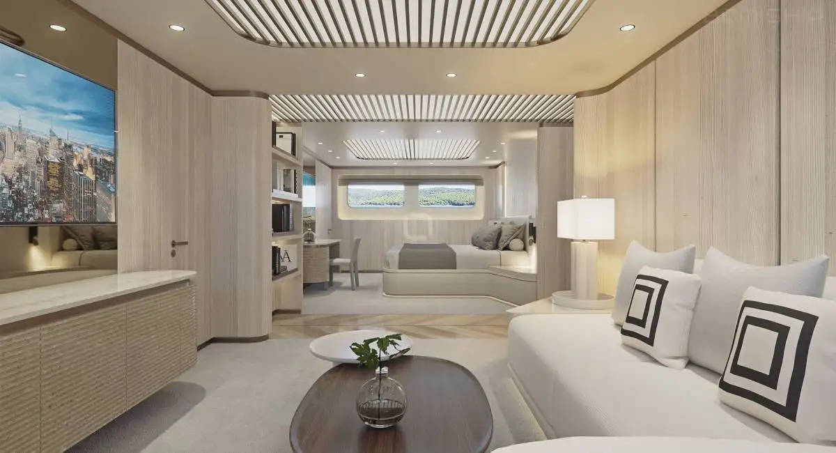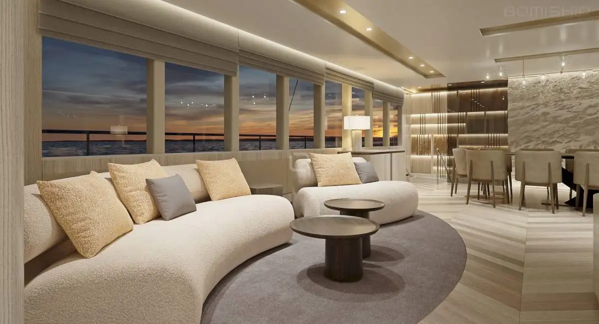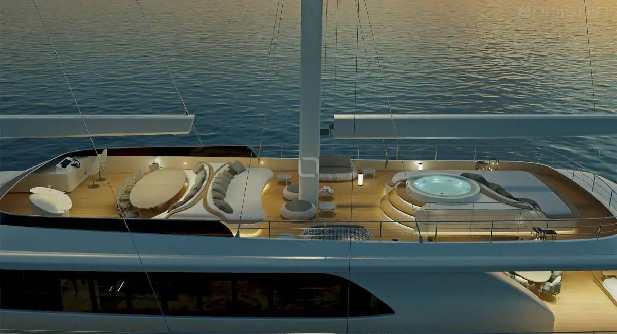 Beach club con sauna finlandese, palestra, ampia piattaforma bagno 20 m², ponti in teak, generatori Kohler 2 x 85 kW e generatore Kohler 1 x 50 kW, aria condizionata, dissalatore Duplex 2 x 300 L/h, tendalini su tutti i ponti, ampia piattaforma prendisole con doccia 20 m², Jacuzzi per sei persone, fabbricatori di ghiaccio x3, cantinette vino nel salone, wet bar, luci d’atmosfera, luci subacquee, proiettore esterno per serate cinema sotto le stelle, aree lounge prendisole.