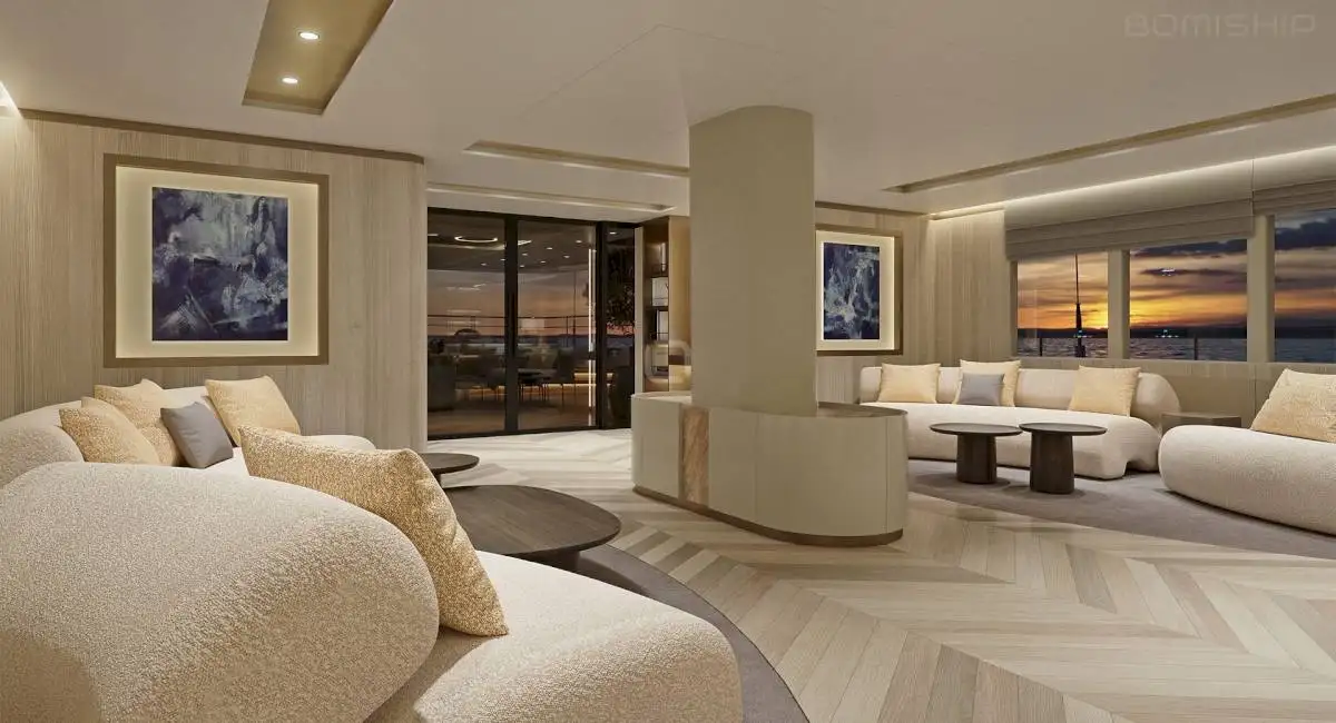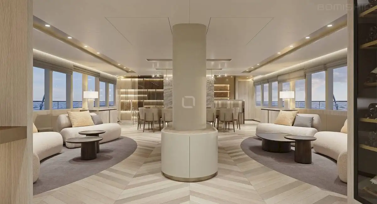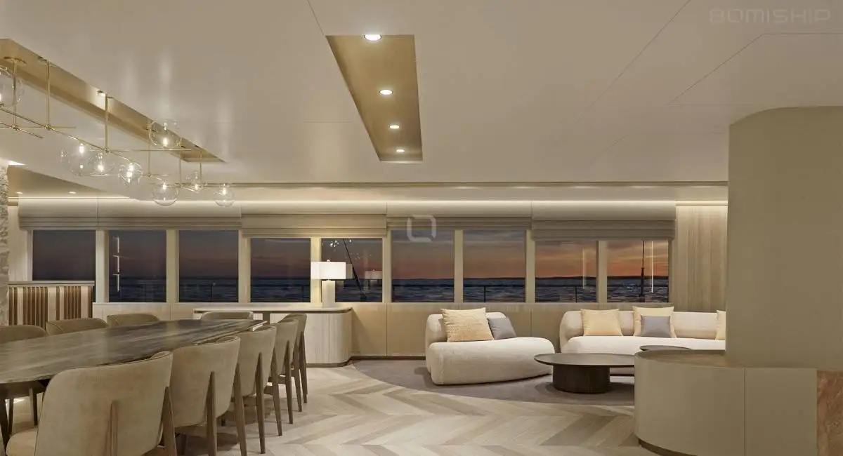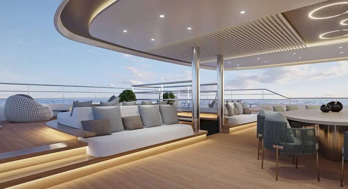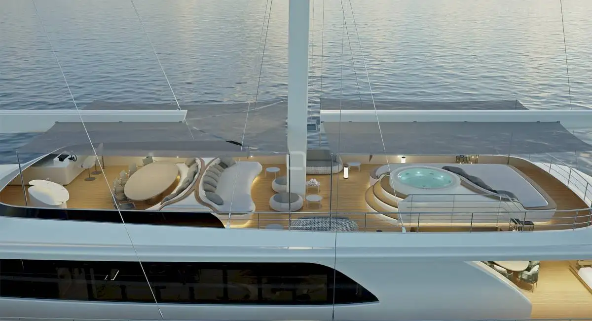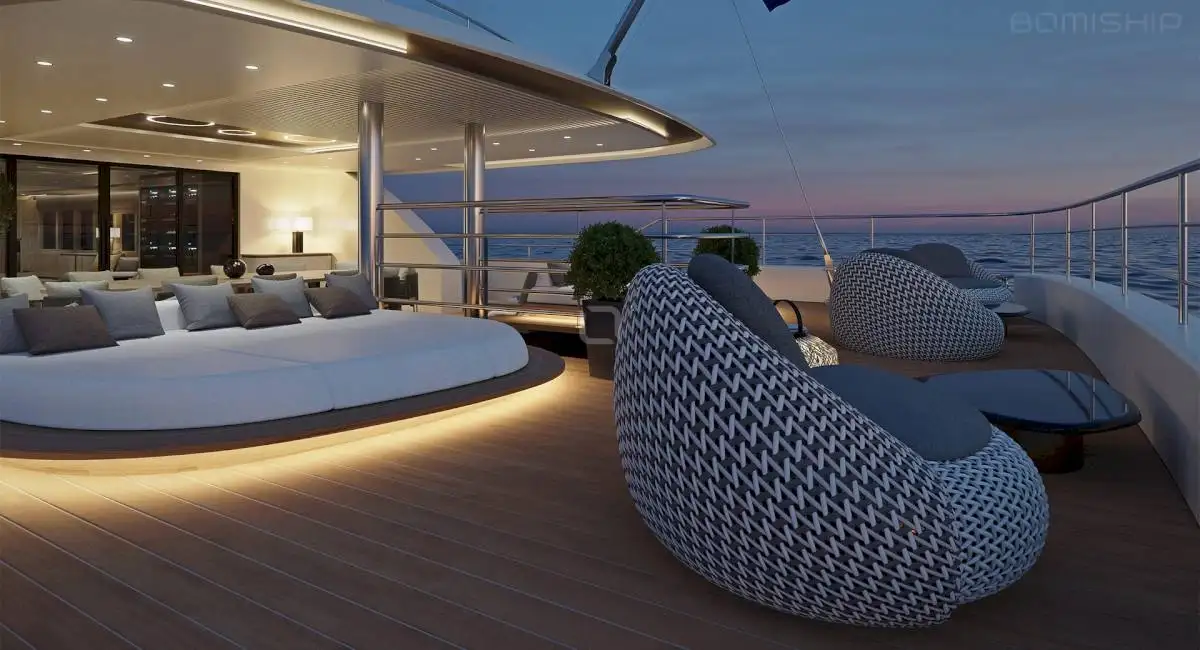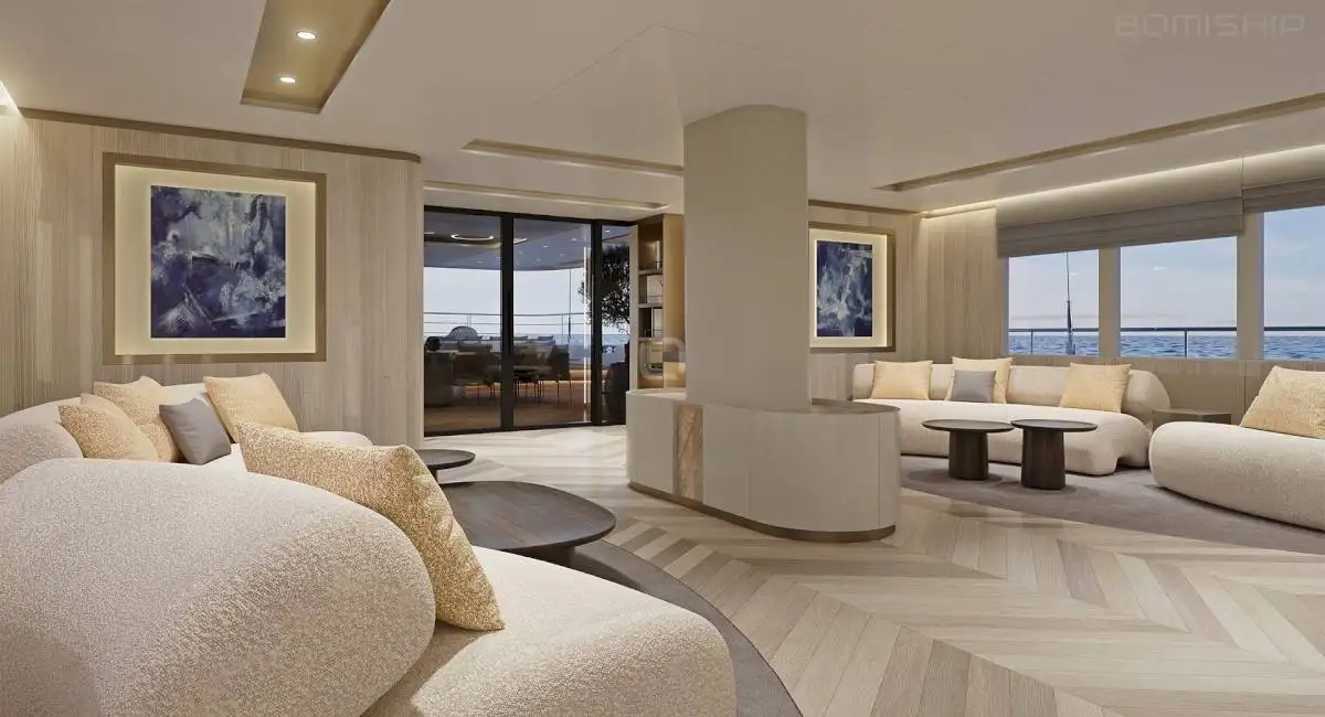 Beach club con sauna finlandese, palestra, ampia piattaforma bagno 20 m², ponti in teak, generatori Kohler 2 x 85 kW e generatore Kohler 1 x 50 kW, aria condizionata, dissalatore Duplex 2 x 300 L/h, tendalini su tutti i ponti, ampia piattaforma prendisole con doccia 20 m², Jacuzzi per sei persone, fabbricatori di ghiaccio x3, cantinette vino nel salone, wet bar, luci d’atmosfera, luci subacquee, proiettore esterno per serate cinema sotto le stelle, aree lounge prendisole.