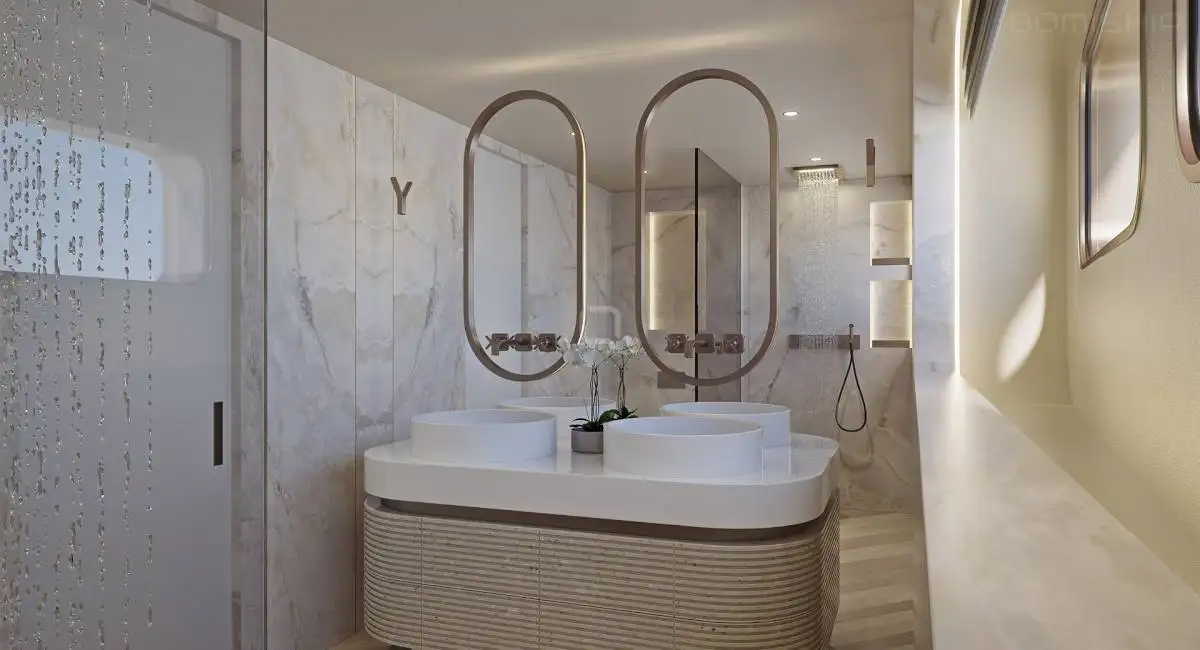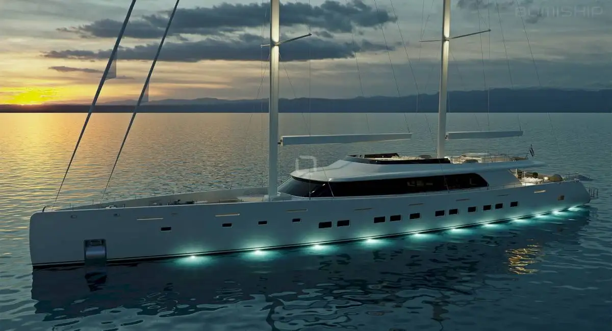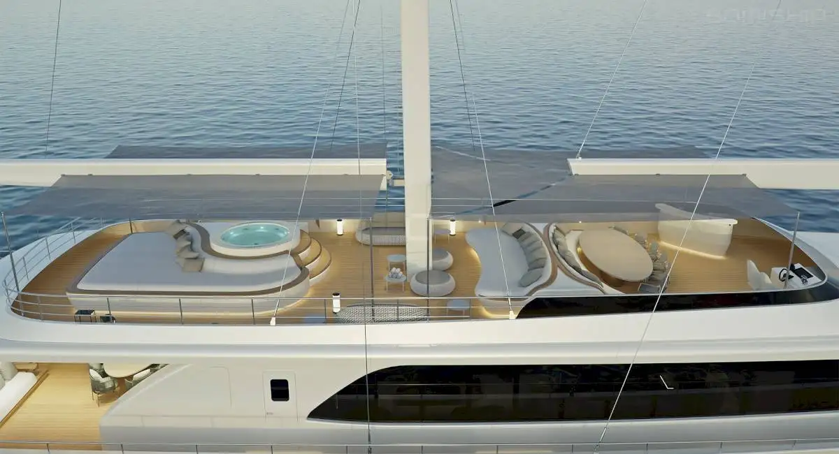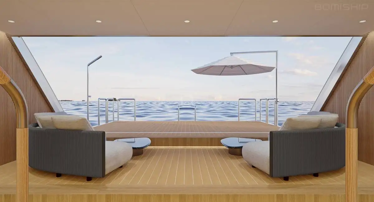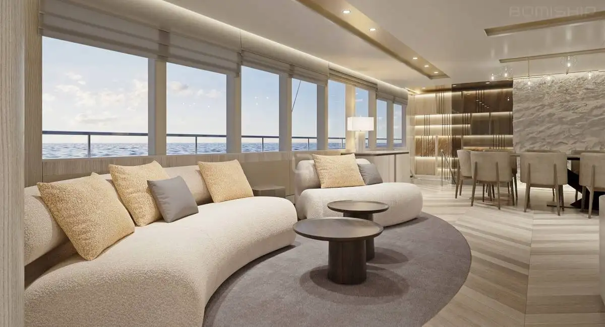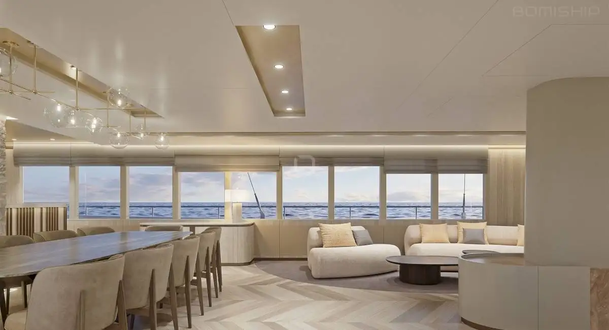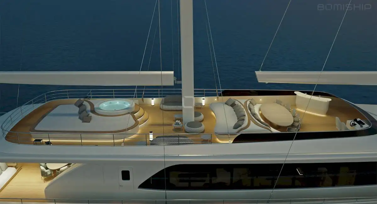 Beach club con sauna finlandese, palestra, ampia piattaforma bagno 20 m², ponti in teak, generatori Kohler 2 x 85 kW e generatore Kohler 1 x 50 kW, aria condizionata, dissalatore Duplex 2 x 300 L/h, tendalini su tutti i ponti, ampia piattaforma prendisole con doccia 20 m², Jacuzzi per sei persone, fabbricatori di ghiaccio x3, cantinette vino nel salone, wet bar, luci d’atmosfera, luci subacquee, proiettore esterno per serate cinema sotto le stelle, aree lounge prendisole.