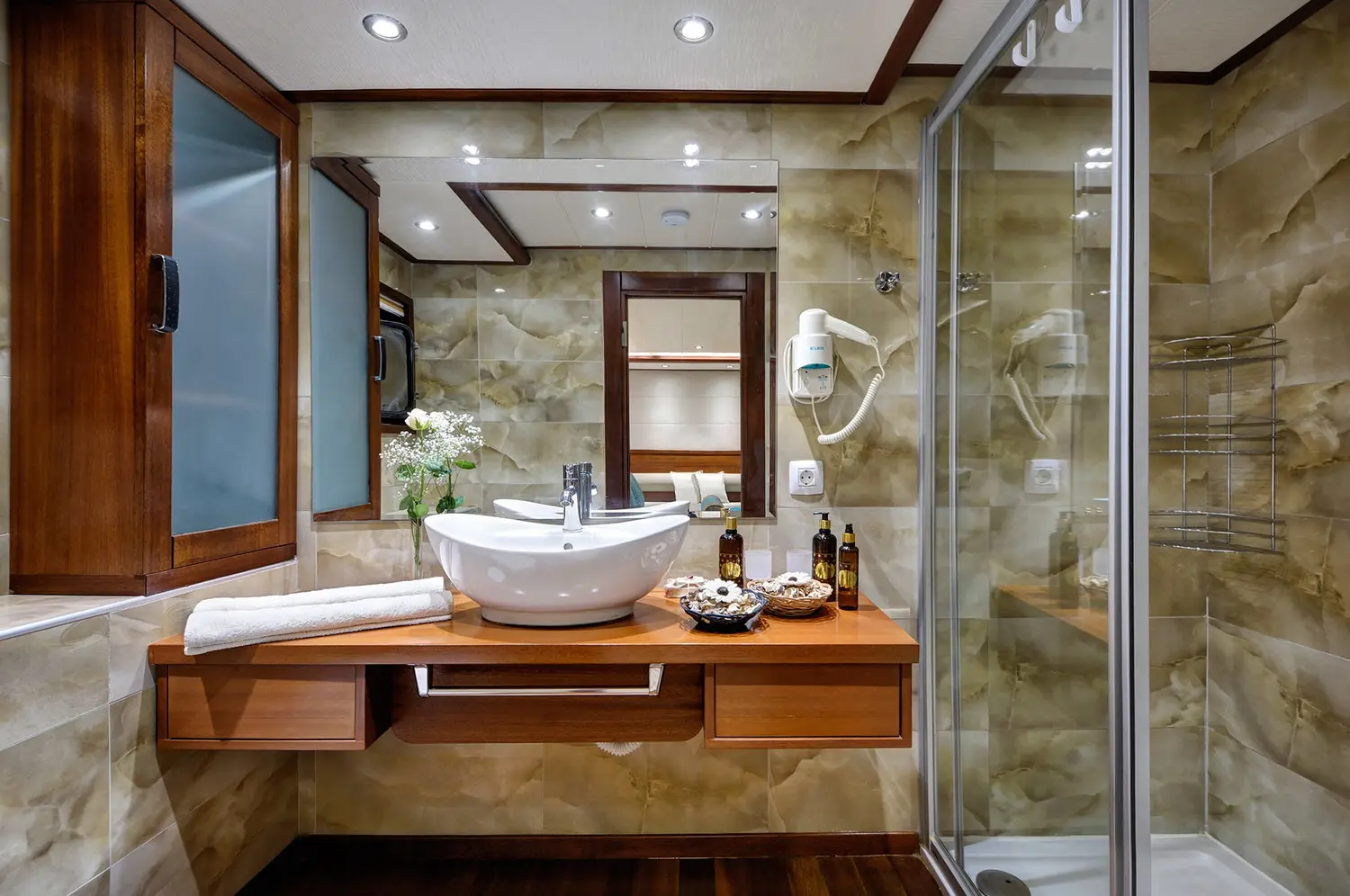 1 x Master Cabin: Cabina di lusso con letto matrimoniale king size. Superficie 28,7 m². Bagno privato con doccia e WC.