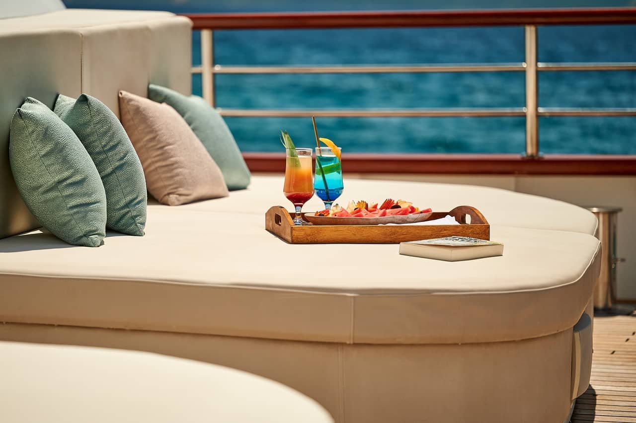 La vera fantasia di navigazione, però, si vive uscendo all’esterno: il ponte principale di 190 metri quadrati offre una spaziosa area lounge e un delizioso tavolo da pranzo, mentre il flybridge dello yacht dispone di sauna, Jacuzzi e di una splendida area prendisole.