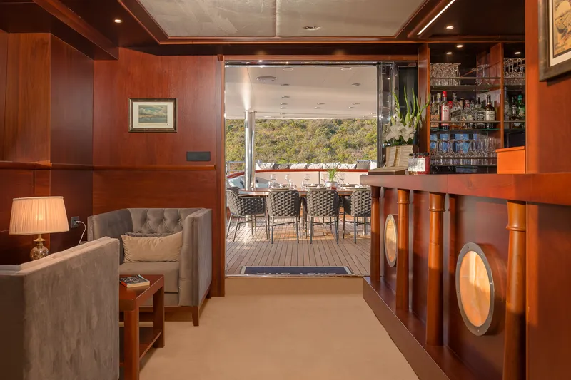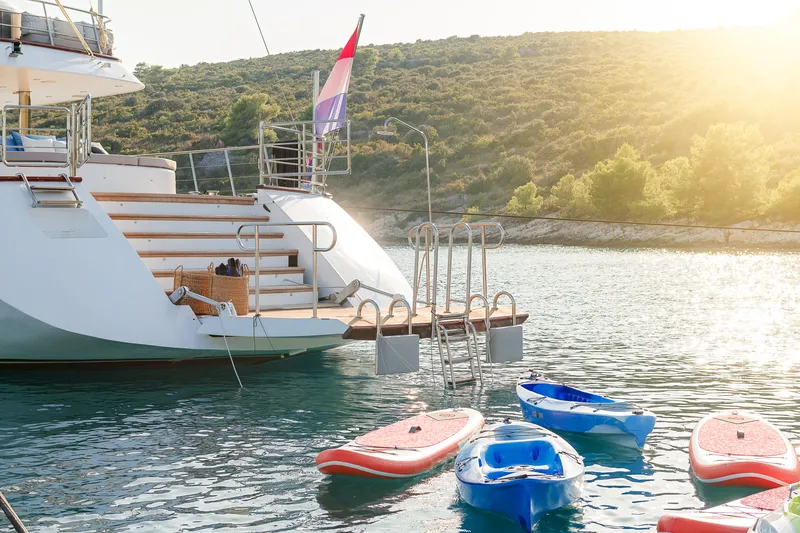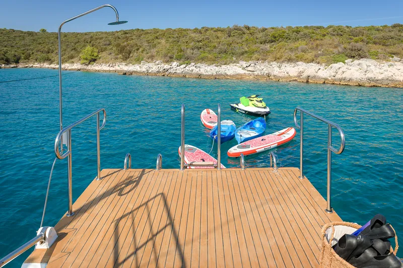 Anche gli esterni dello yacht sono altrettanto accattivanti, con un’ampia area dedicata al tempo libero, un flybridge di 88 metri quadrati e una jacuzzi a poppa. Lady Gita dispone di un’ampia lista di attrezzature per il tempo libero, tra cui due kayak, sci nautici, un tender, un jet ski, un wakeboard, un donut, paddle board e attrezzatura per pesca e snorkeling.
