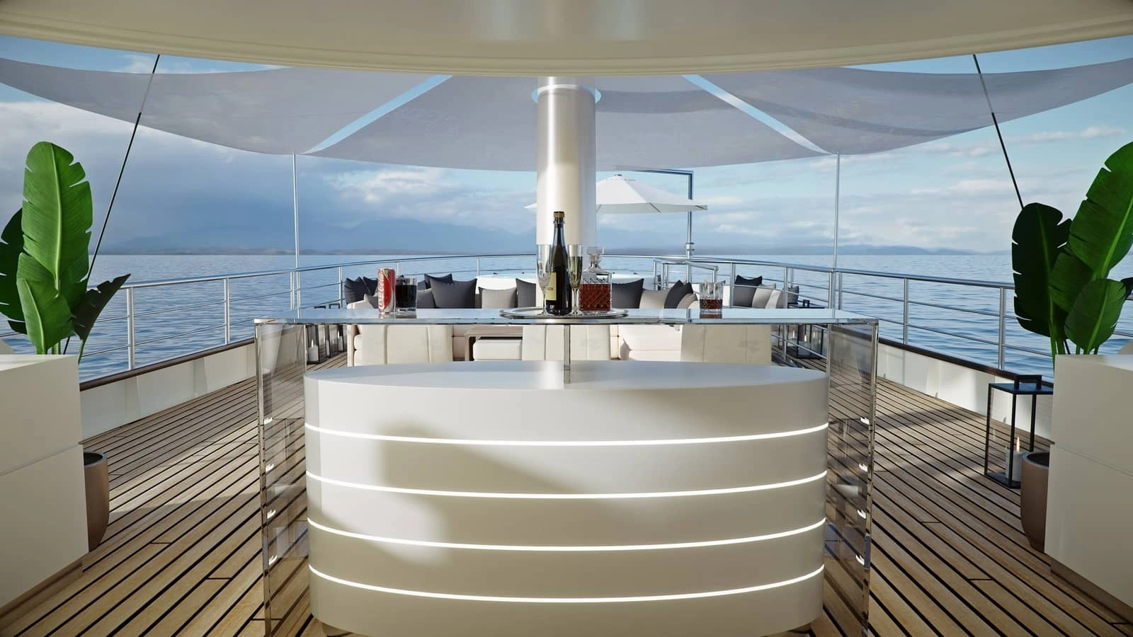 • Accesso all’acqua senza sforzo – Una piattaforma da bagno retrattile si abbassa fino al livello del mare, garantendo un facile accesso all’acqua e ai tender, con spazi dedicati per il deposito di jet ski, piattaforme gonfiabili e altri giochi d’acqua, sia a prua che a poppa.