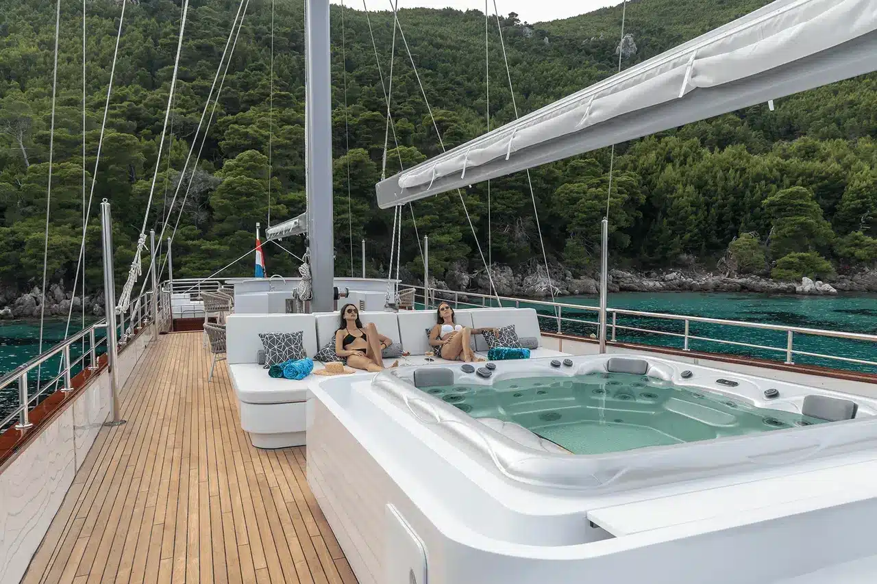 Sul ponte di poppa si trova una piattaforma con cuscini e un bellissimo tavolo per pranzare all’aperto, ideale per assaporare gustosi piatti preparati dallo chef privato dello yacht.