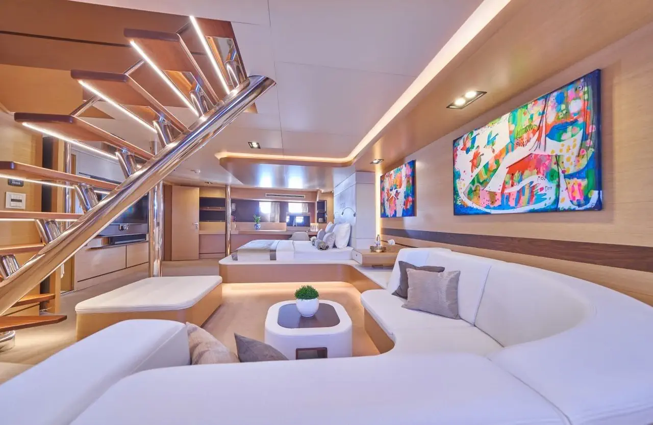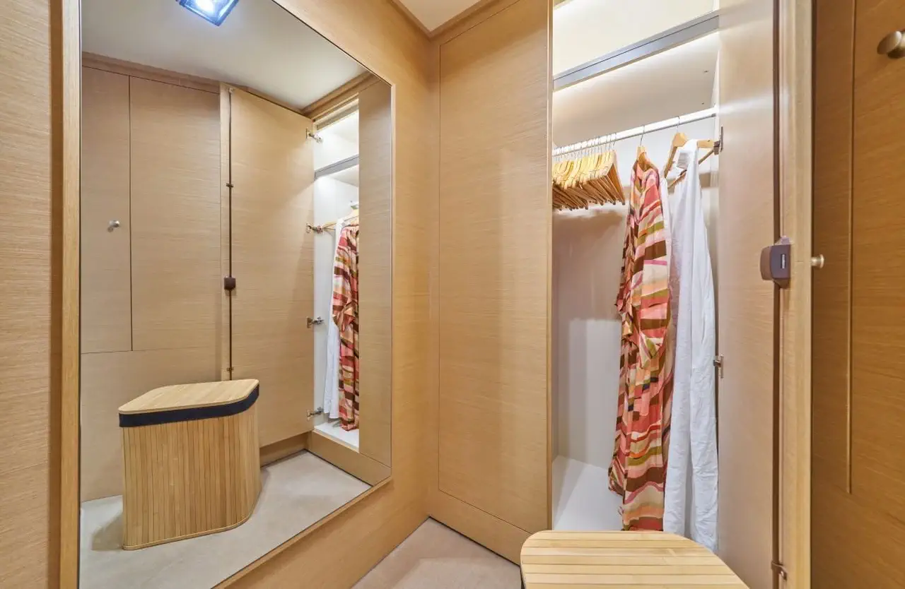 Una suite armatoriale, una cabina VIP, 2 cabine matrimoniali e 2 cabine convertibili dispongono tutte di bagno privato en-suite, aria condizionata, Wi-Fi, TV a schermo piatto, cassetta di sicurezza, interfono, impianto surround e ampi spazi di stivaggio.