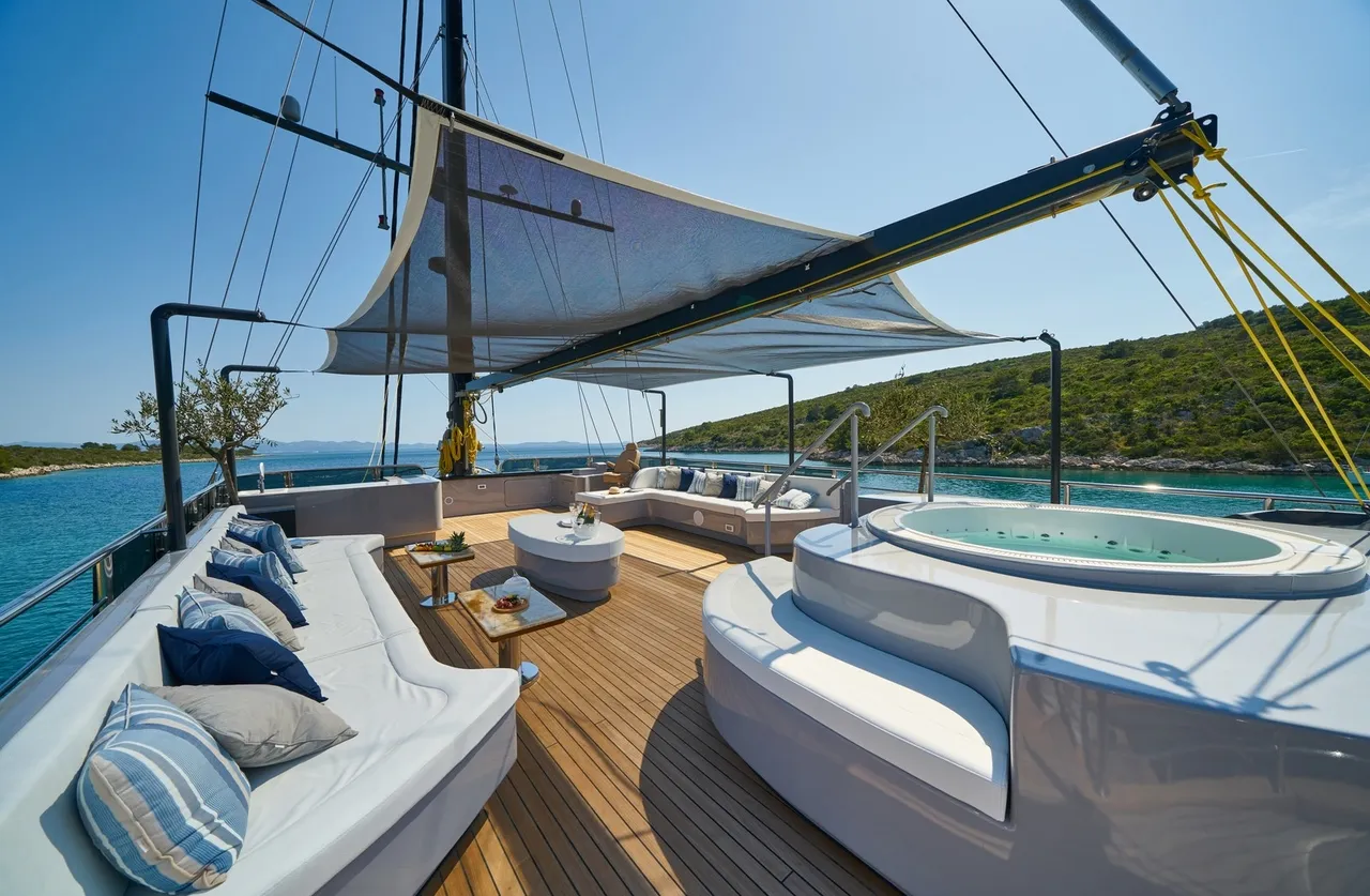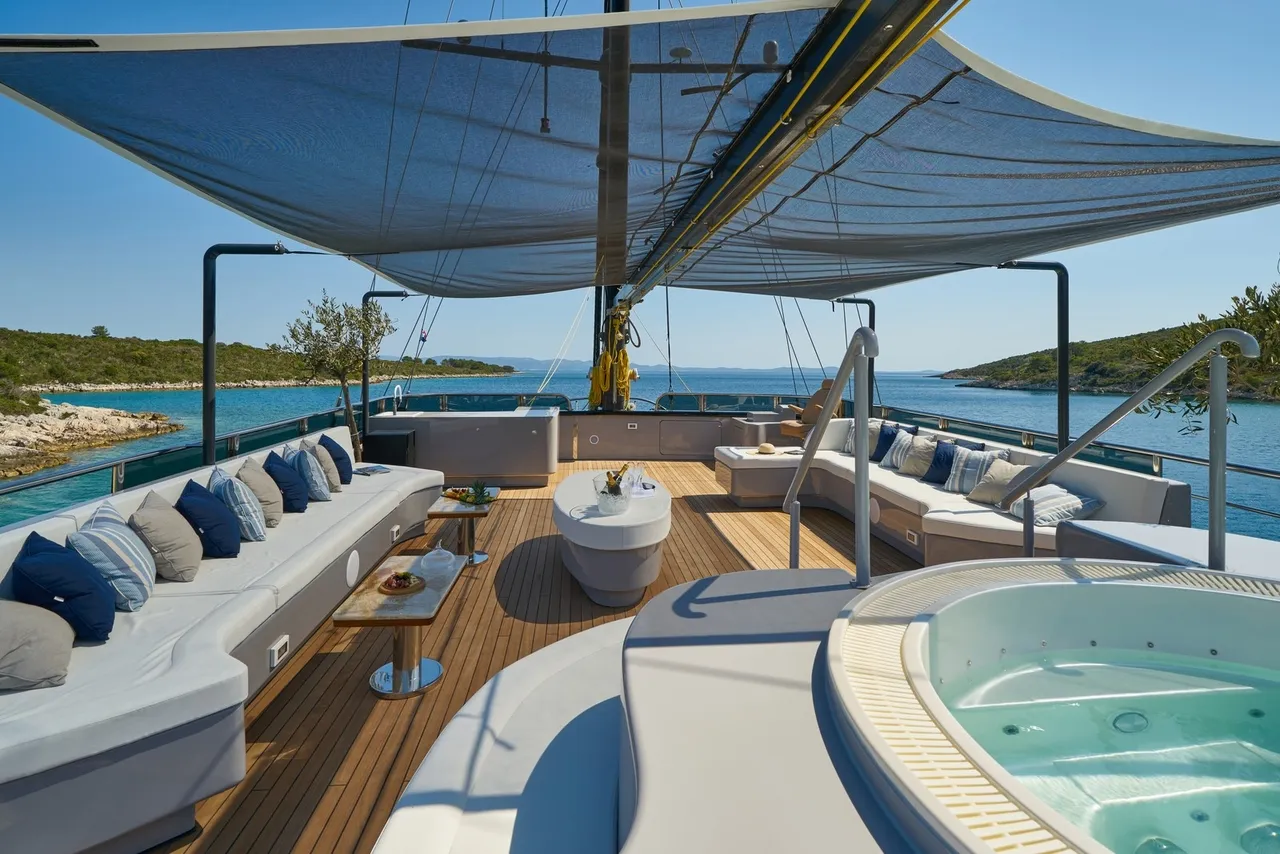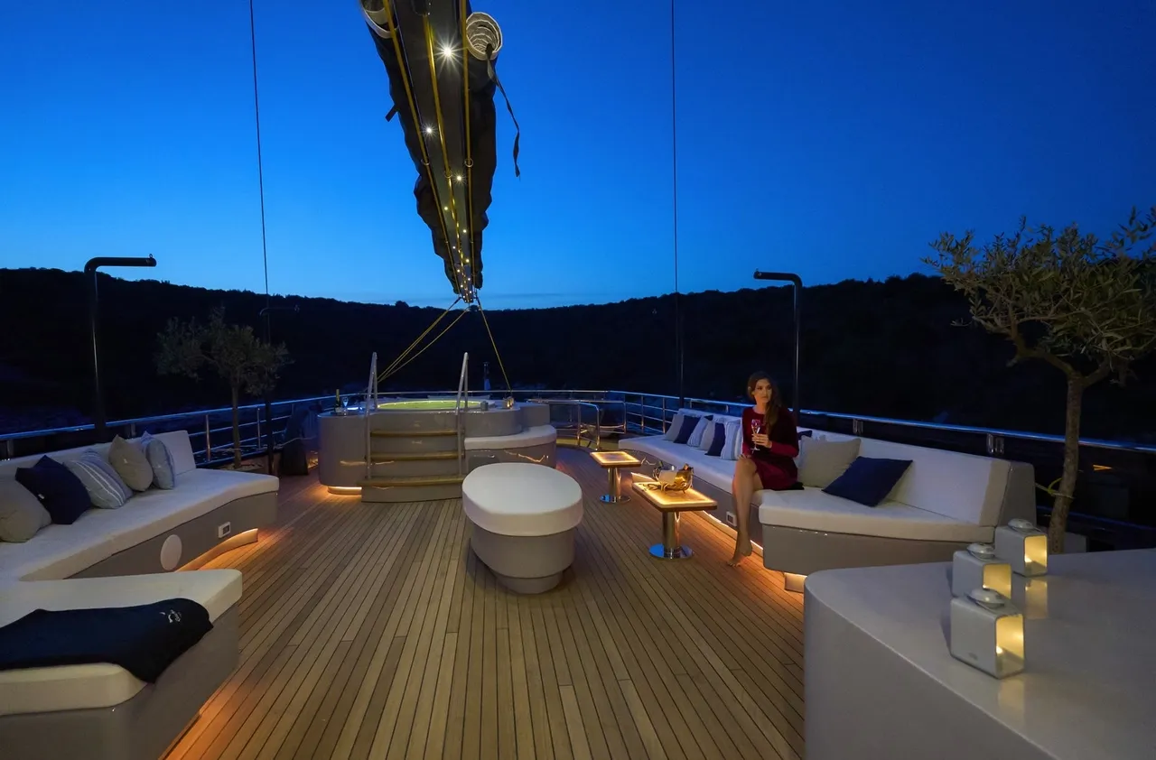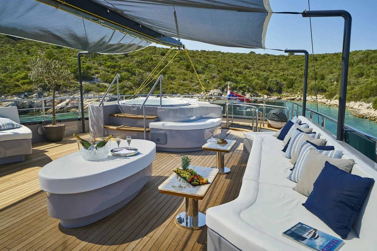 • Sundeck: ampio Jacuzzi circondato da morbidi materassini prendisole, area lounge imbottita, doccia esterna e due zone salotto con tavolini da caffè, elegantemente ombreggiate dagli alberi dello yacht