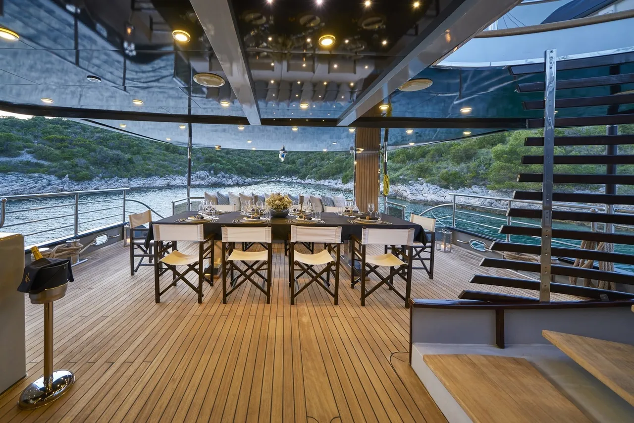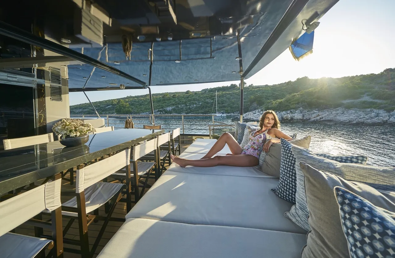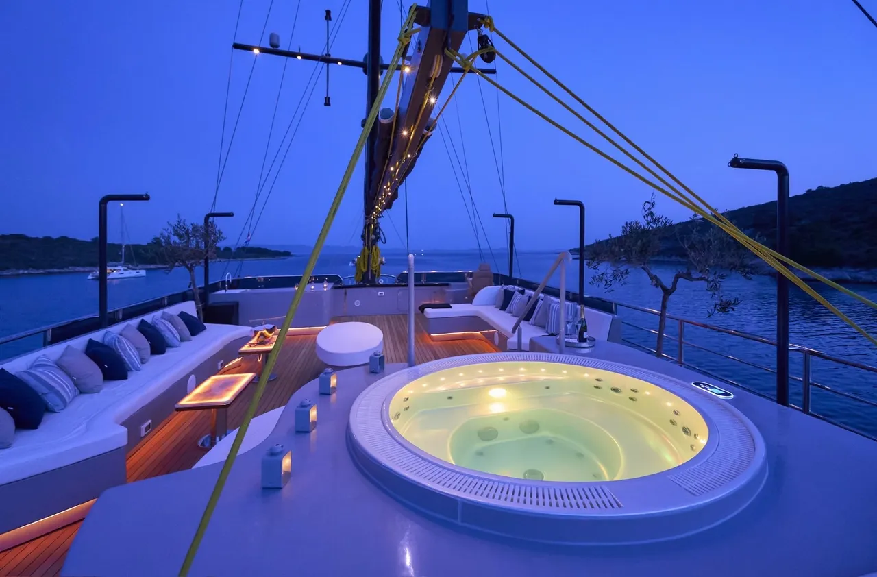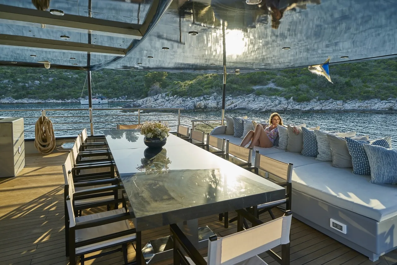 • Sundeck: ampio Jacuzzi circondato da morbidi materassini prendisole, area lounge imbottita, doccia esterna e due zone salotto con tavolini da caffè, elegantemente ombreggiate dagli alberi dello yacht