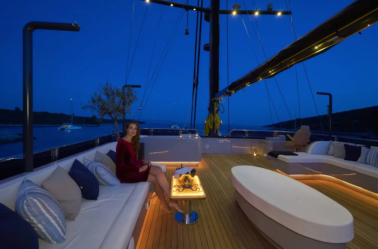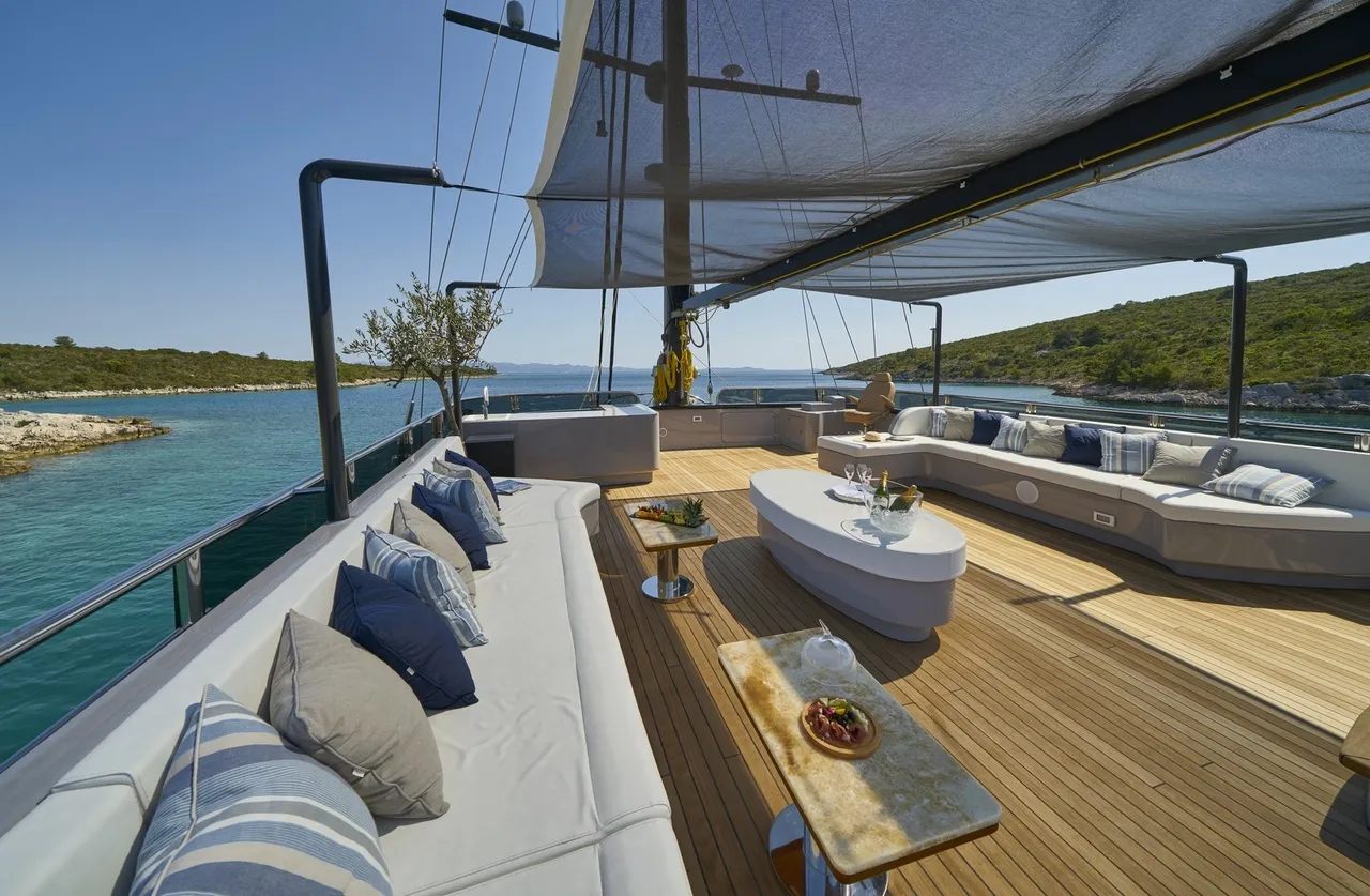 Ugualmente bello è il salone che offre la combinazione ideale di eleganza moderna e confort totale. Le aree esterne dello yacht, invece, fanno possibile di vivere comodamente le vacanze all’aperto. Alla prua si trova la zona pranzo ombreggiata da tende dove potete gustare i pasti squisiti o sdraiarsi sul divano con una bibita in mano.