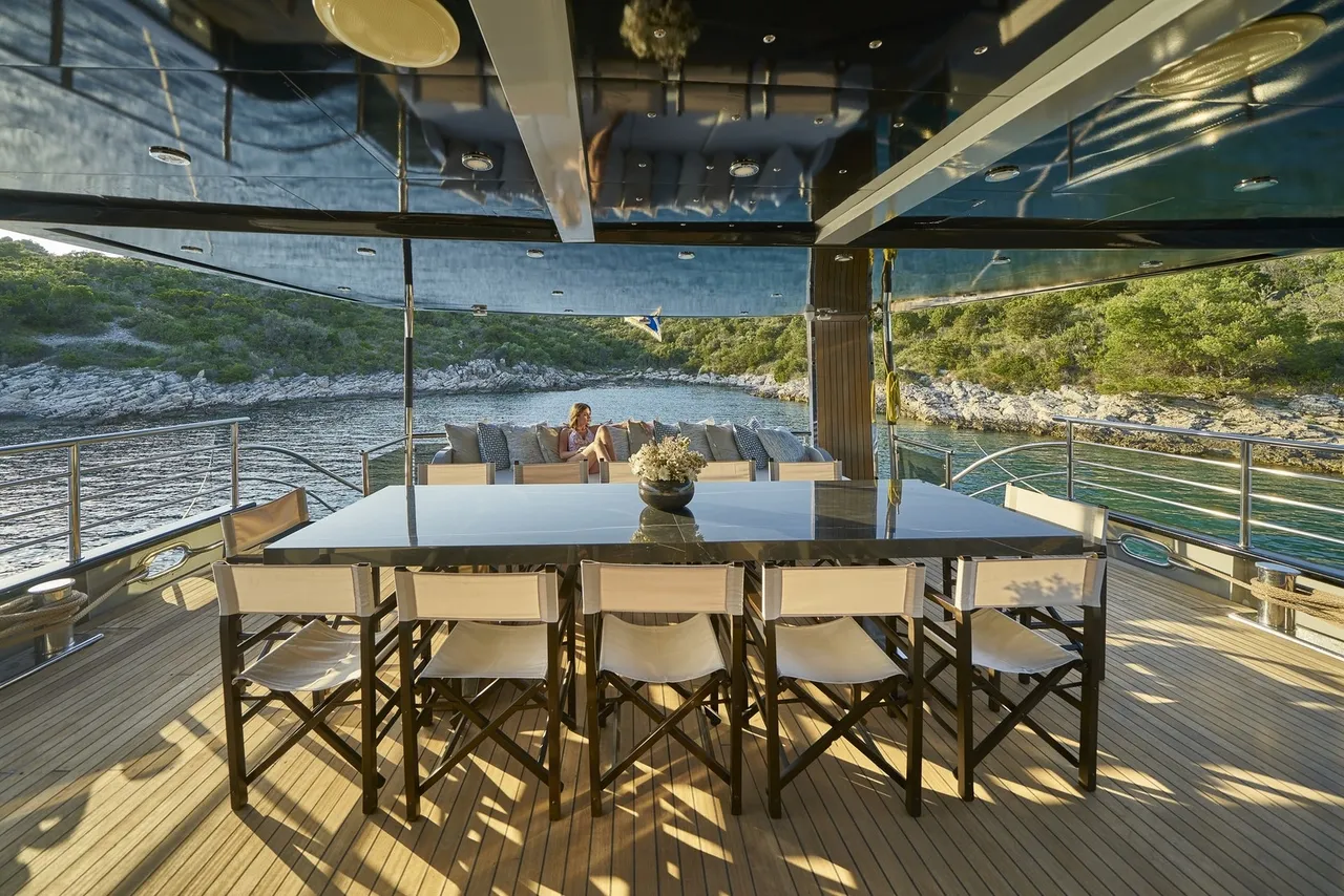 • Ponte di poppa: piattaforma imbottita con copertura rigida, accogliente area pranzo all’aperto e comode sedute, perfetta per rilassarsi o gustare i pasti all’aria aperta