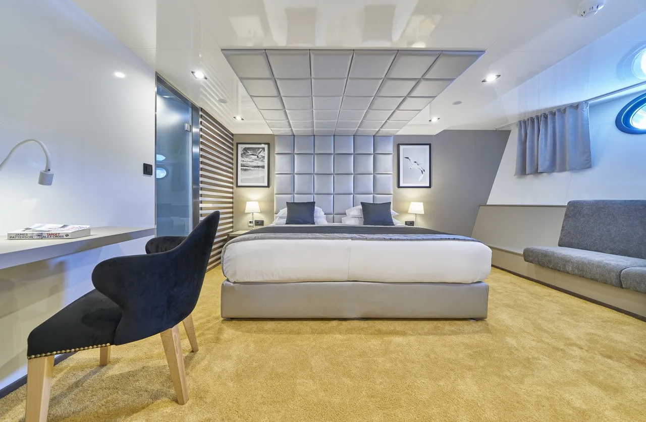 12 passeggeri possono essere ospitati in 2 cabine doppie, 2 cabine matrimoniali, una cabina armatoriale e una cabina VIP. Le cabine sono eleganti e spaziose, con aria condizionata e bagni privati.