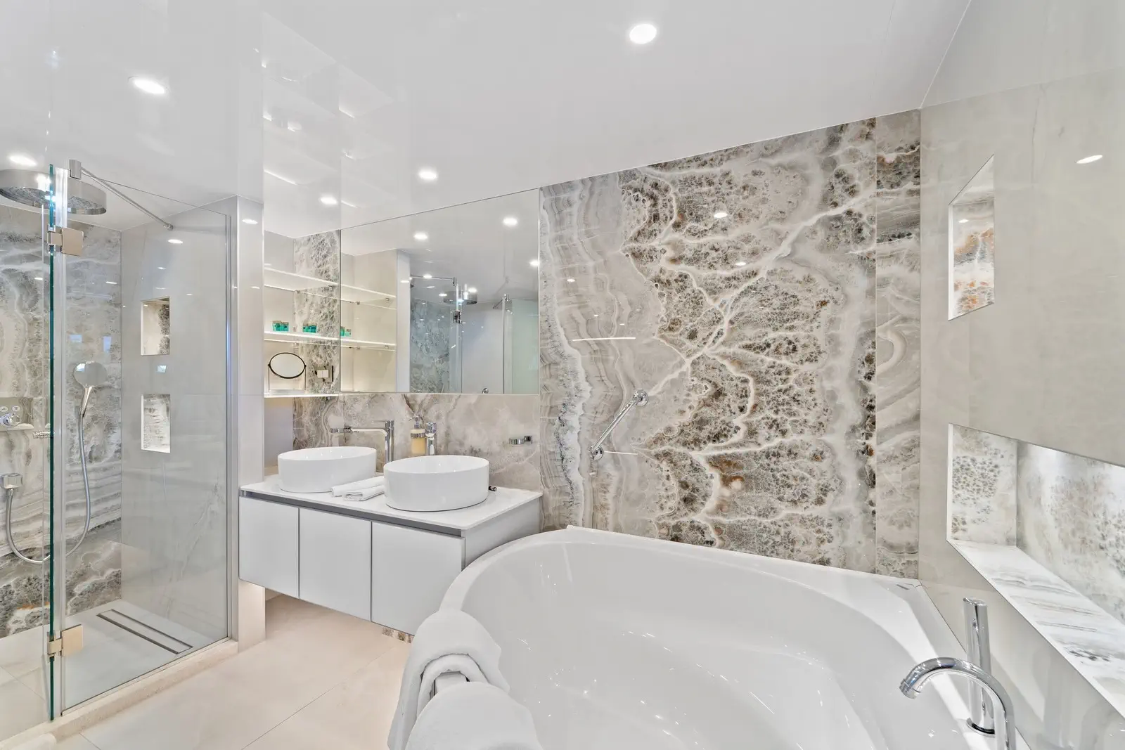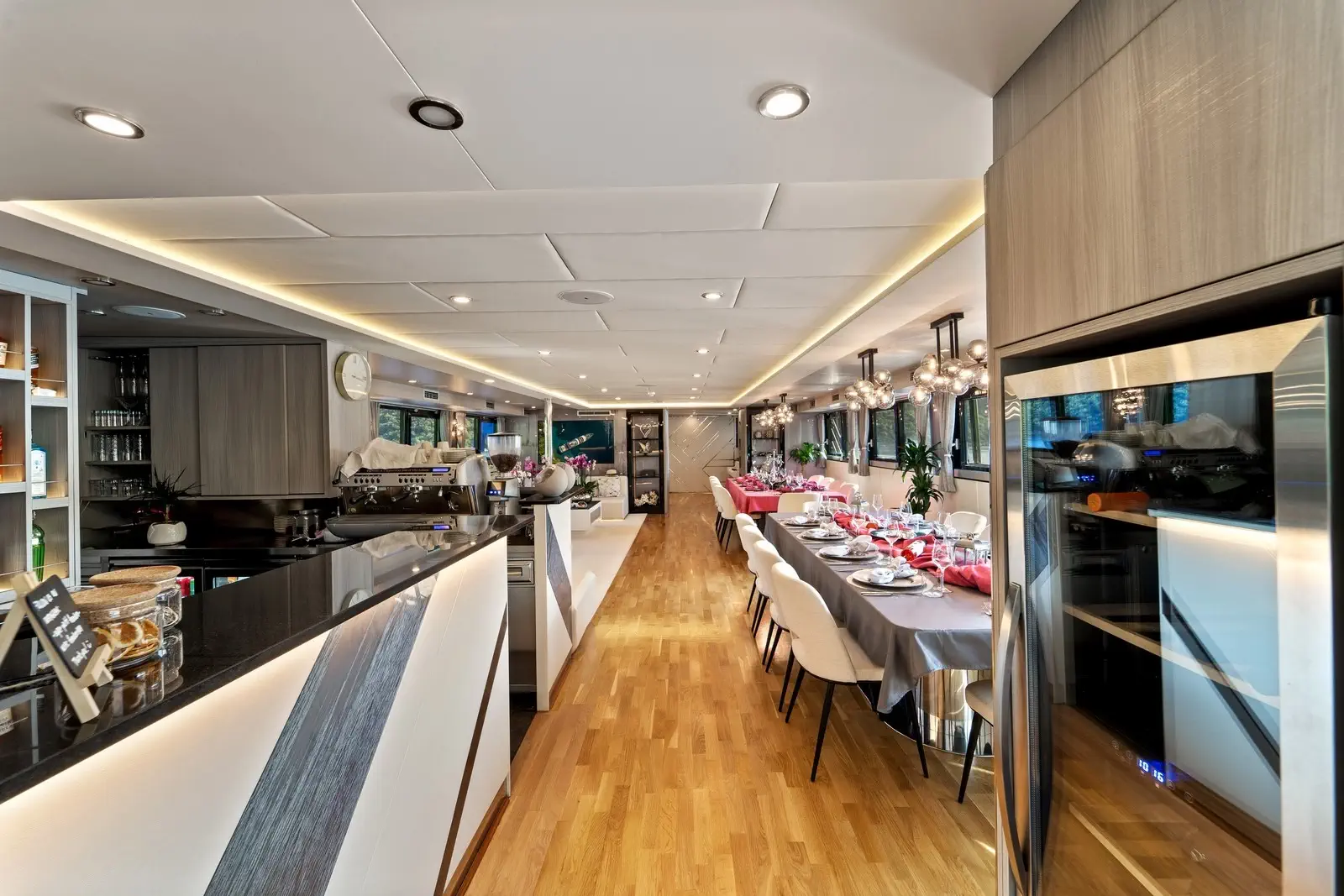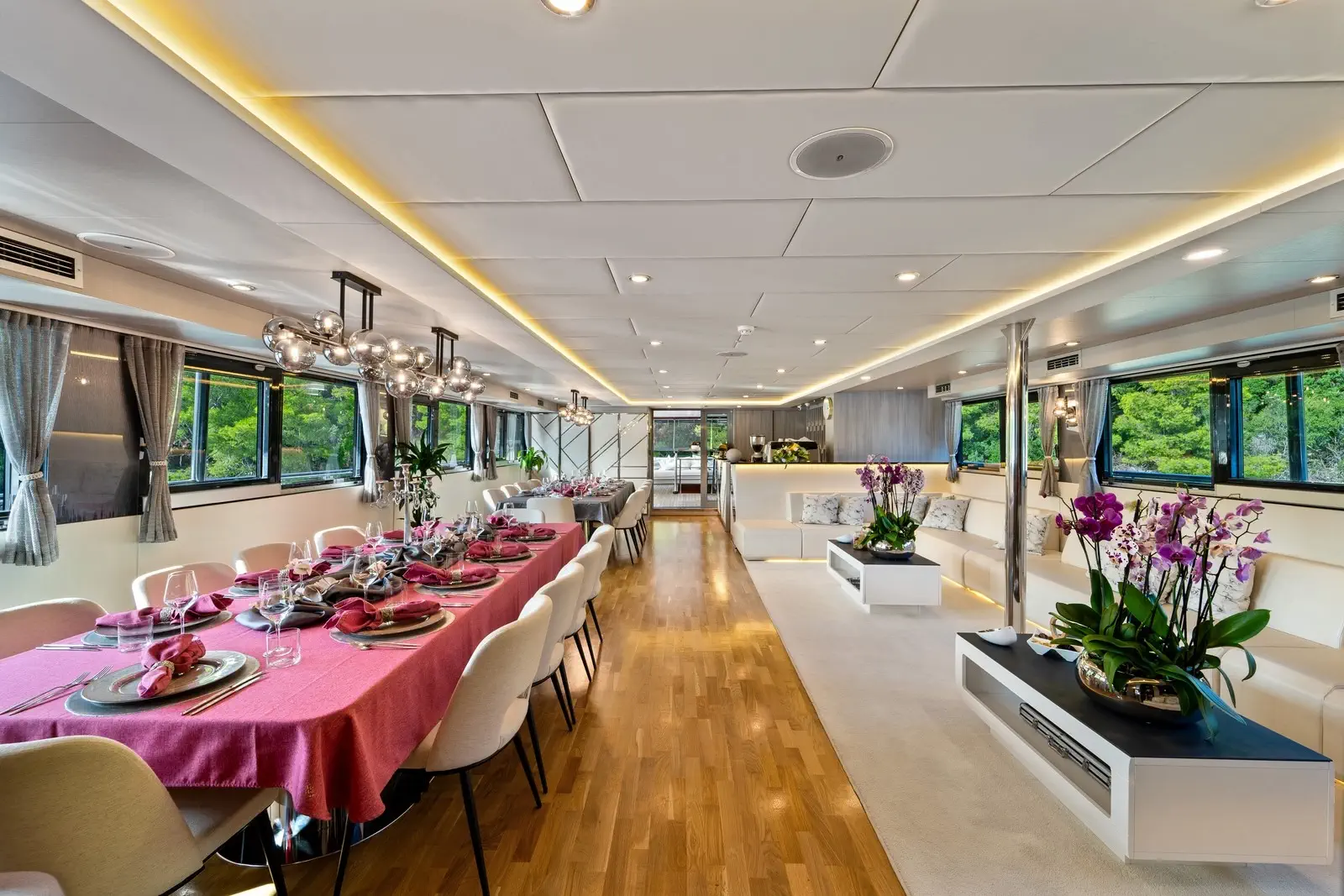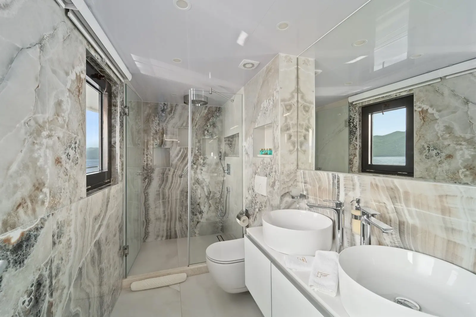 Le 11 cabine, arredate in modo impeccabile, comprendono 2 enormi cabine armatoriali, 6 cabine matrimoniali, 1 cabina VIP, oltre a 1 cabina tripla e 1 cabina con letti gemelli, situate sul ponte principale e sul ponte inferiore. Tutte le cabine sono dotate di bagno privato en-suite e sono completamente climatizzate. Sul ponte inferiore si trovano anche una sala massaggi, una sauna con doccia e una sala cinema / videogiochi con 2 file di comodi divani. Il resto delle aree interne comprende il salone, con tavolini e divani, nonché due lunghi tavoli da pranzo sul lato opposto della sala.