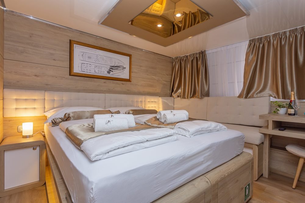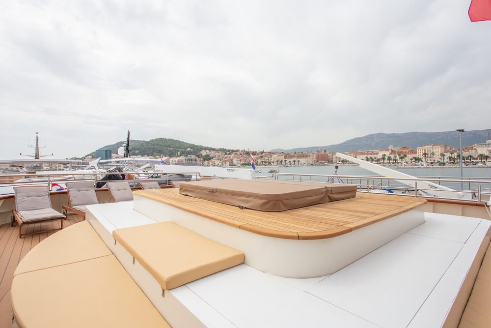 L’imbarcazione offre un ampio sundeck che mette a disposizione molto spazio per prendere il sole. Inoltre, lo yacht dispone di una Jacuzzi e di una piattaforma bagno attrezzata con comodi gradini, che consente agli ospiti di accedere con facilità e immergersi nelle incontaminate acque turchesi del pittoresco Mare Adriatico durante le soste bagno nel corso della crociera.
