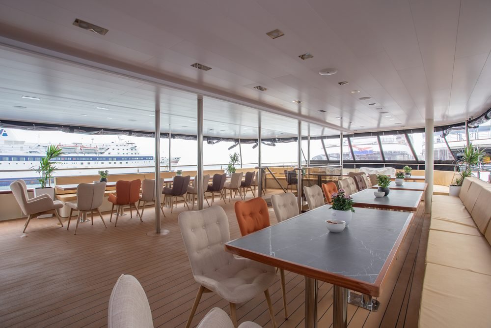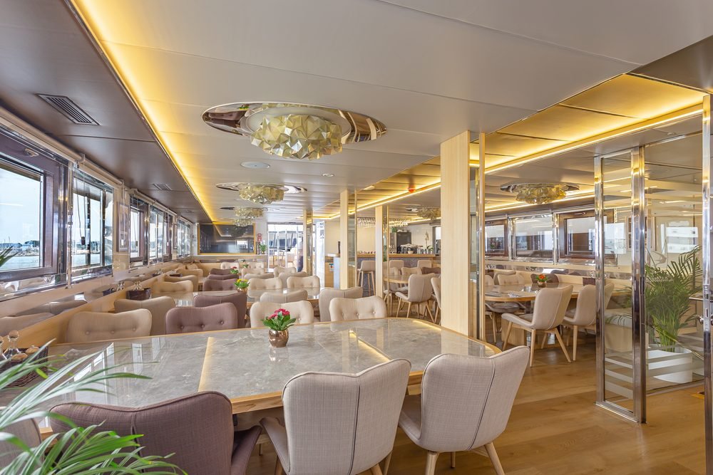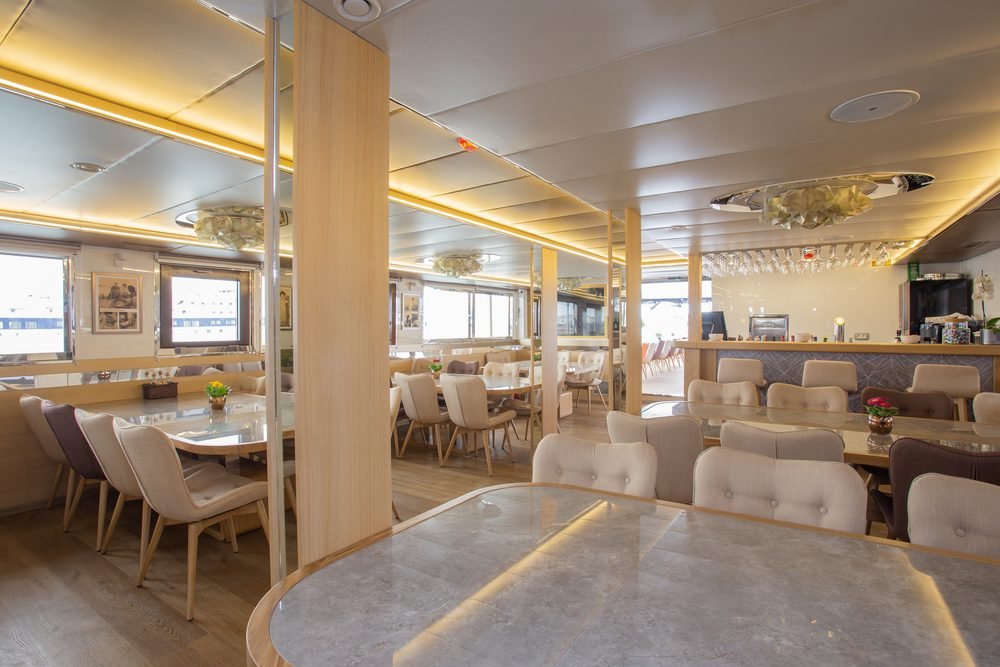 Il ponte superiore del lussuoso minicruiser Swallow ospita un salone/ristorante completamente climatizzato con una zona pranzo separata con finestre panoramiche e un salone VIP/lounge bar. Questa tranquilla oasi interna dispone anche di Wi-Fi, TV LCD e di un tavolo per il buffet della colazione.
