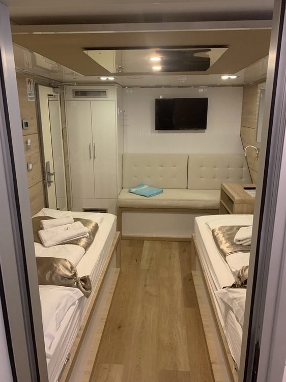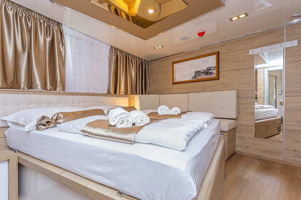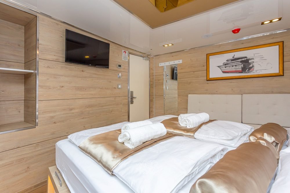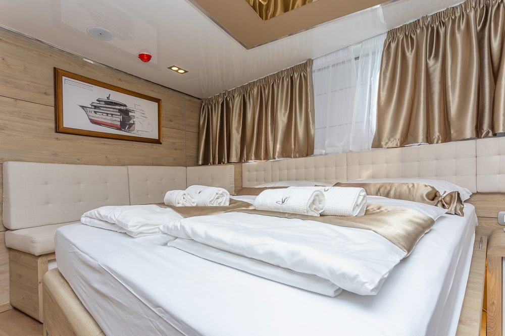 Le 18 cabine del lussuoso mini cruiser Swallow spaziano dalle matrimoniali (con configurazione a letto matrimoniale e opzione di un terzo letto aggiuntivo) alle cabine con letti gemelli (anch’esse con opzione di un terzo letto). Le cabine si trovano sul ponte principale e sul ponte inferiore e ciascuna è dotata di bagno privato en-suite. Sono progettate per offrire il massimo comfort e arredate con gusto. Inoltre, la cabina dispone di TV SAT, Wi-Fi, cassetta di sicurezza, rilevatori di fumo e incendio, set di cortesia per il bagno, armadio e guardaroba con mobili e cassetti.