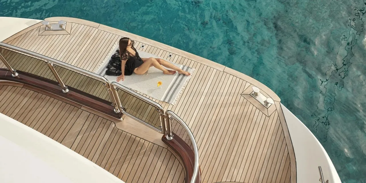 • The aft deck features a cushioned platform with plenty of space and a lovely dining table for al-fresco dining