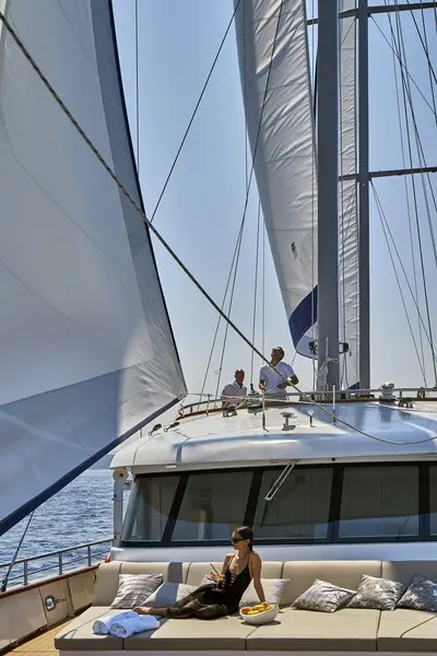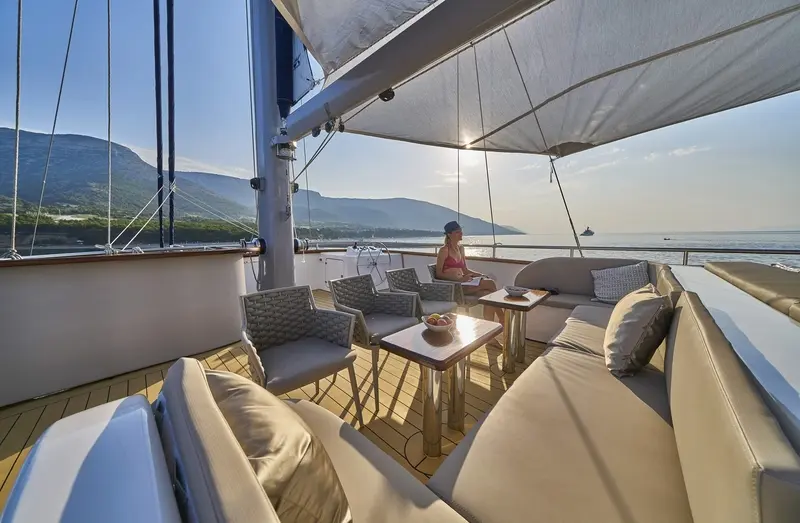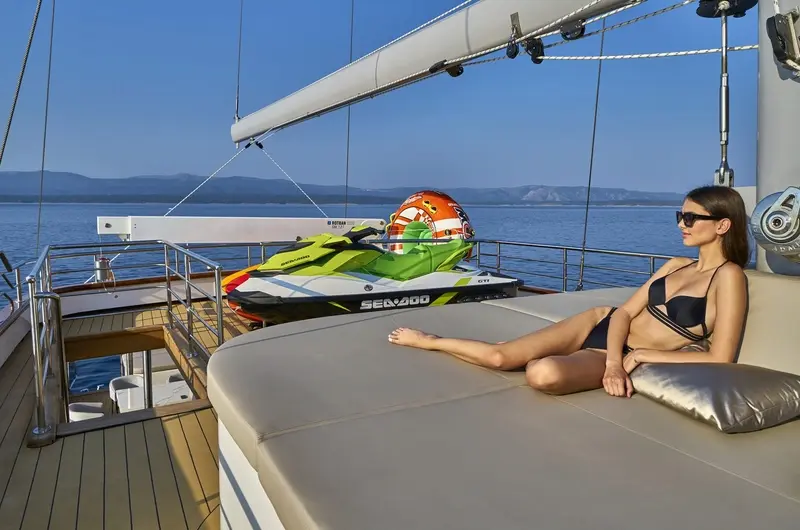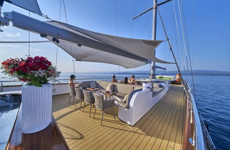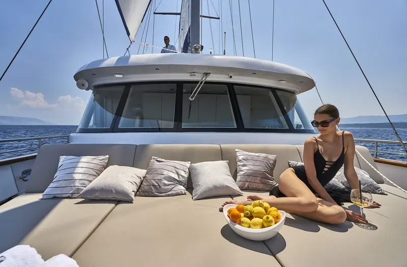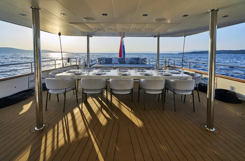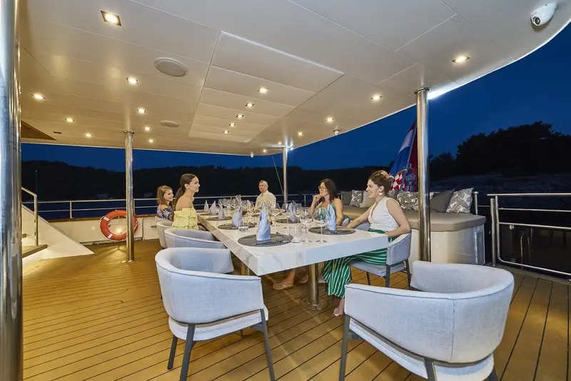 • The aft deck has a cushioned platform offering an abundance of space with a beautiful dining table for al-fresco dining