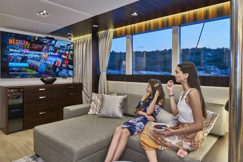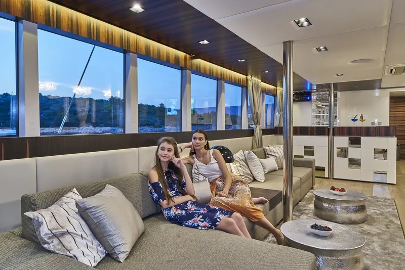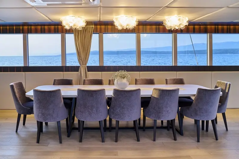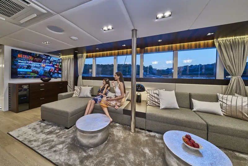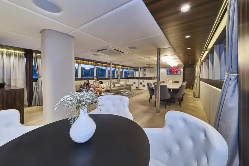 • The main saloon combines a dining area with an elegant bar and lounge area with TV,CD/ DVD,USB