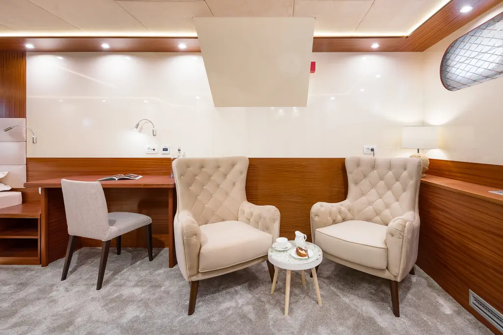 • 1 x Master Cabin – Cabin 34 m2 with king size bed 200×200. Private bathroom with shower box and toilet