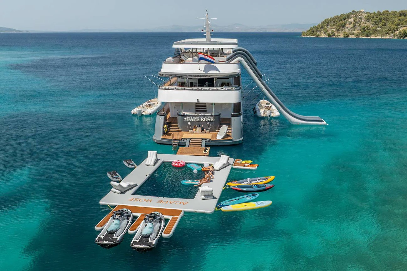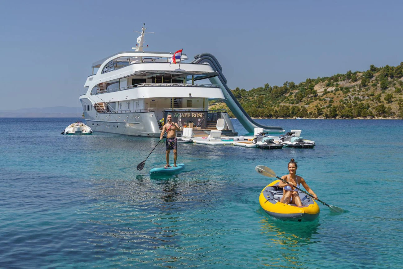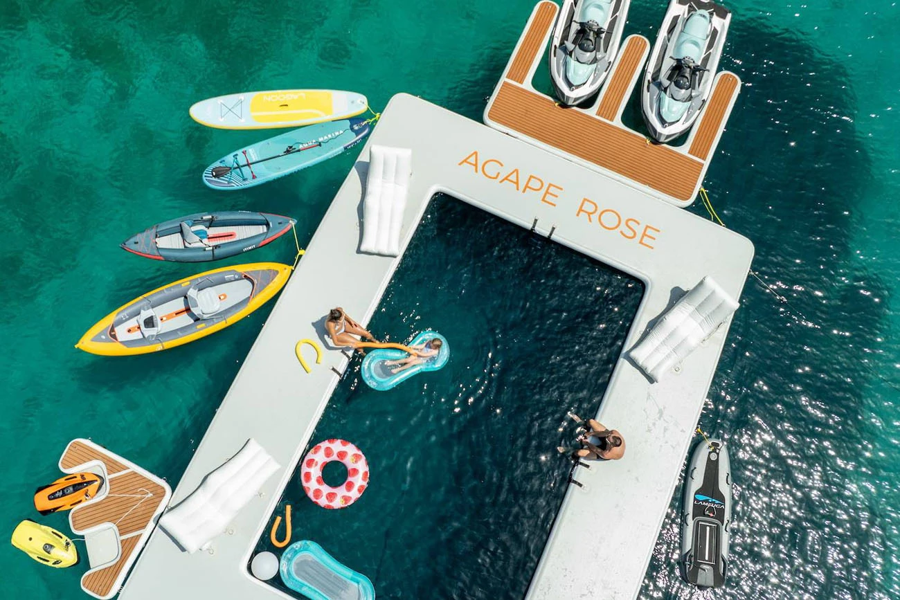 Agape Rose is fully equipped for guests who enjoy an active cruising lifestyle. A wide range of water toys is available on board, including jet skis, Seabobs, a Fliteboard eFoil, paddleboards, kayaks, wakeboards, water skis, an inflatable slide, and a jellyfish swimming platform. Two powerful tenders support water sports, guest transfers, and towing activities throughout the charter.