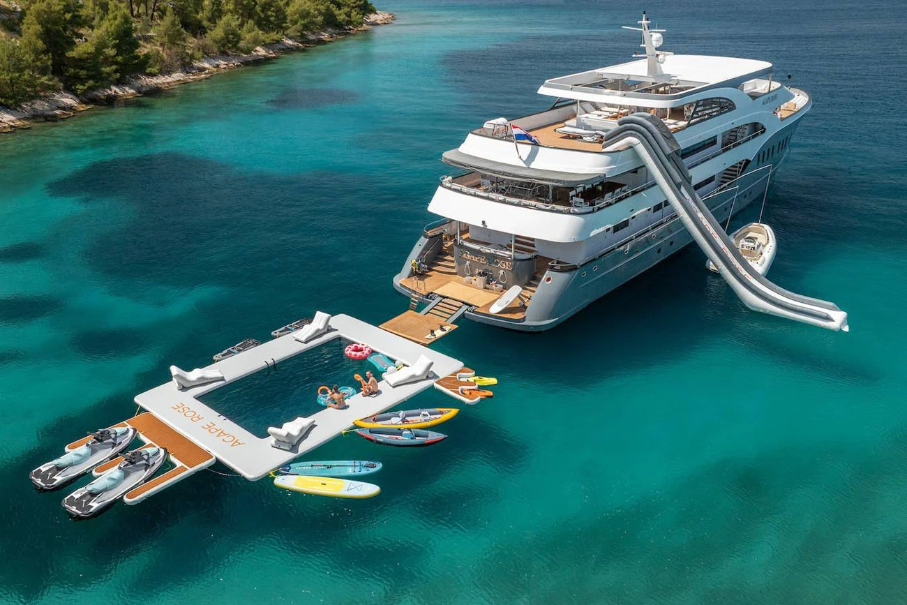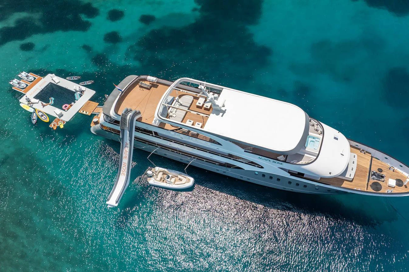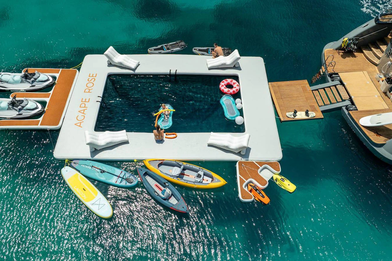 Agape Rose is fully equipped for guests who enjoy an active cruising lifestyle. A wide range of water toys is available on board, including jet skis, Seabobs, a Fliteboard eFoil, paddleboards, kayaks, wakeboards, water skis, an inflatable slide, and a jellyfish swimming platform. Two powerful tenders support water sports, guest transfers, and towing activities throughout the charter.
