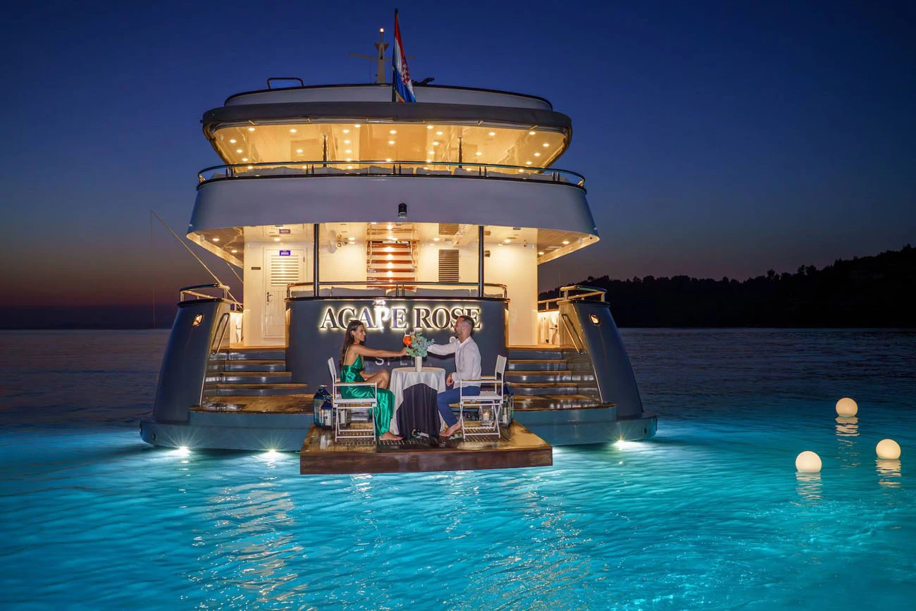 Agape Rose is a luxury mini cruiser designed for private Adriatic cruises, offering generous space while maintaining a high level of comfort and privacy for up to 22 guests. With wellness facilities, flexible accommodation, and an experienced crew, she is well suited to high-capacity private yacht charters in the Adriatic.