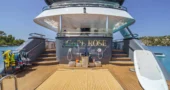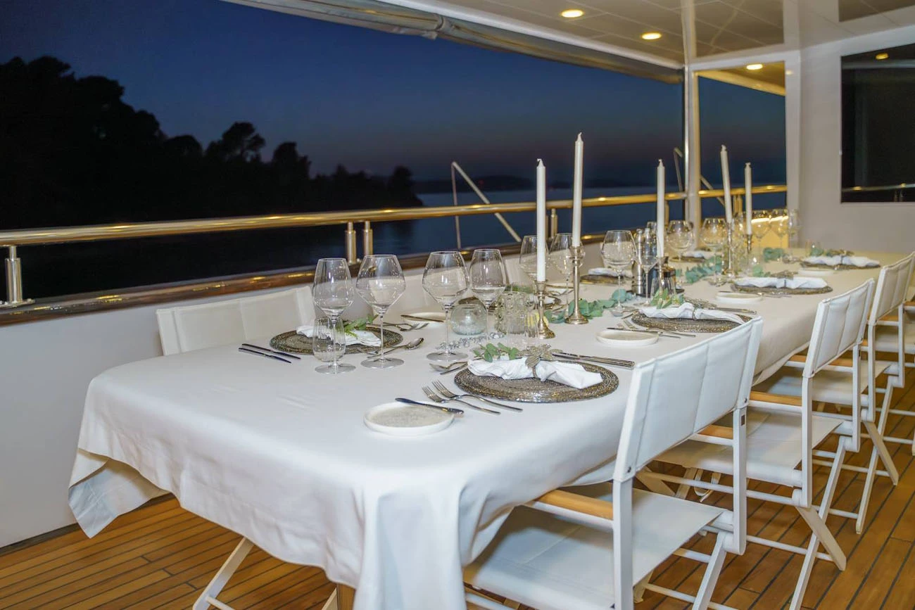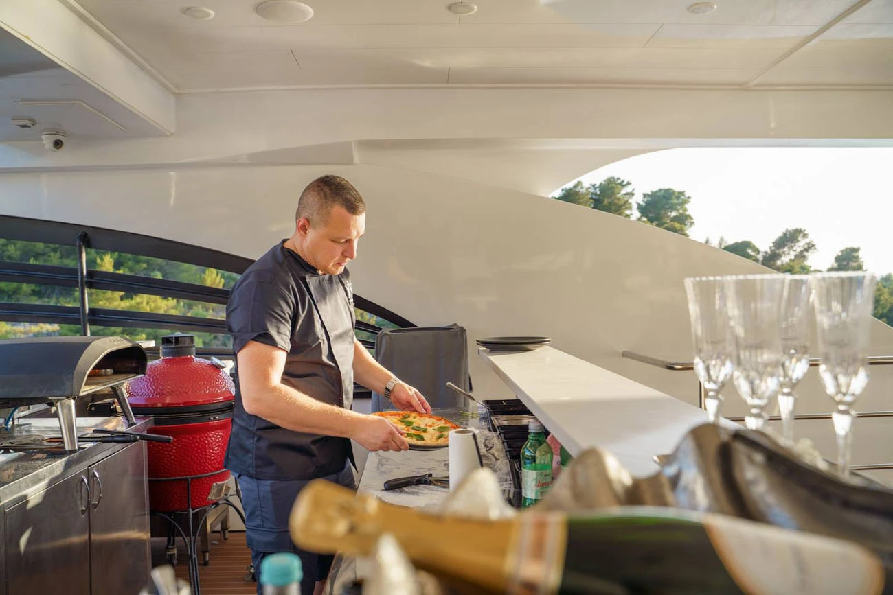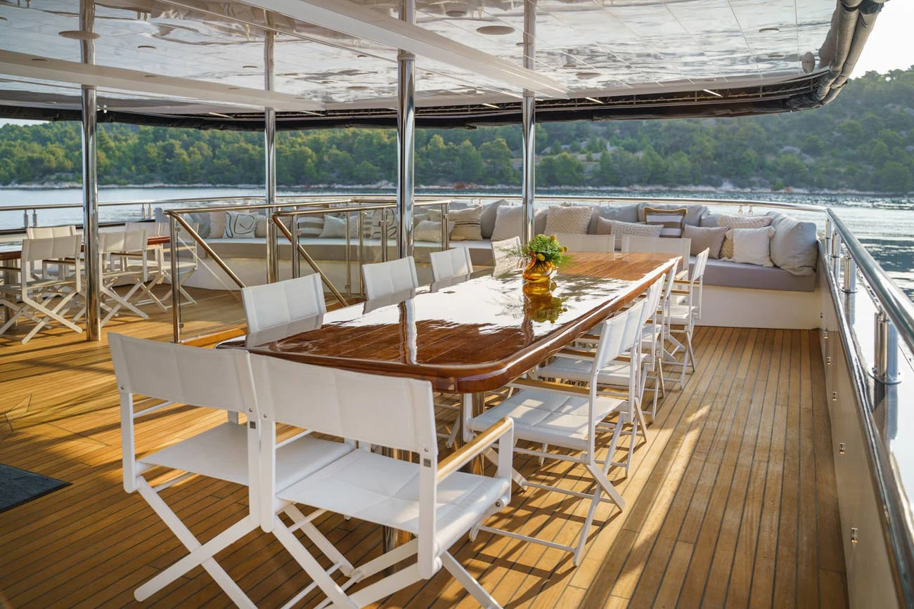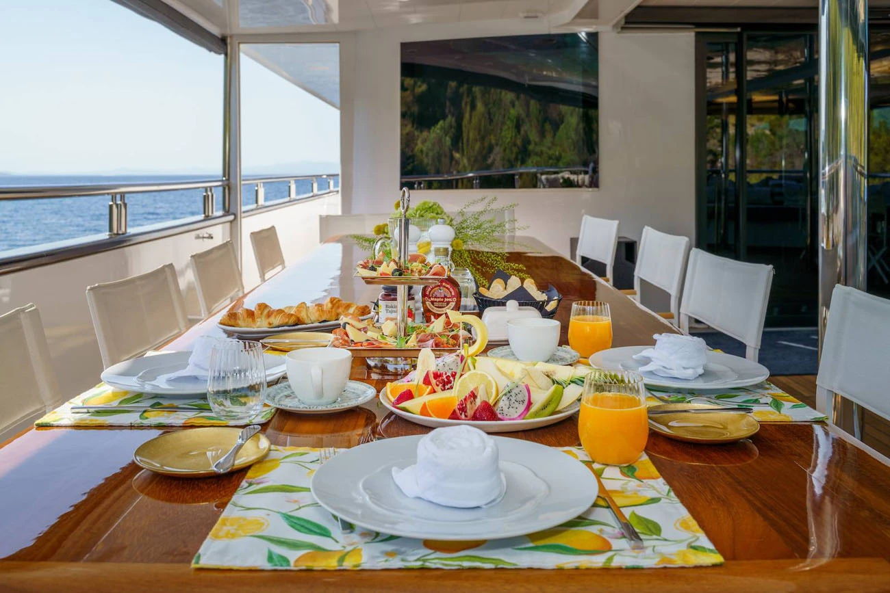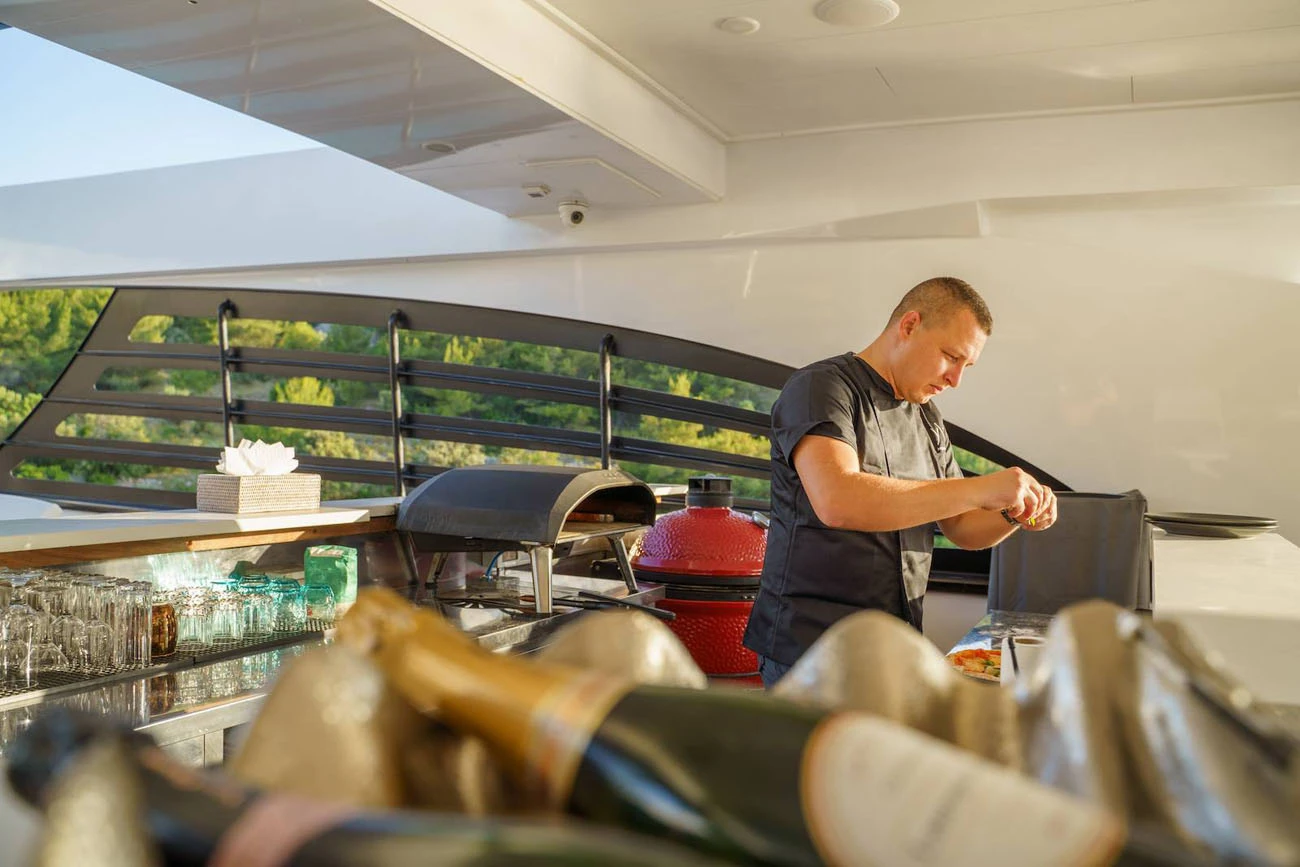 A dedicated bar, outdoor kitchen, and additional dining space provide full service on the sundeck throughout the charter, supporting a private luxury cruise experience.