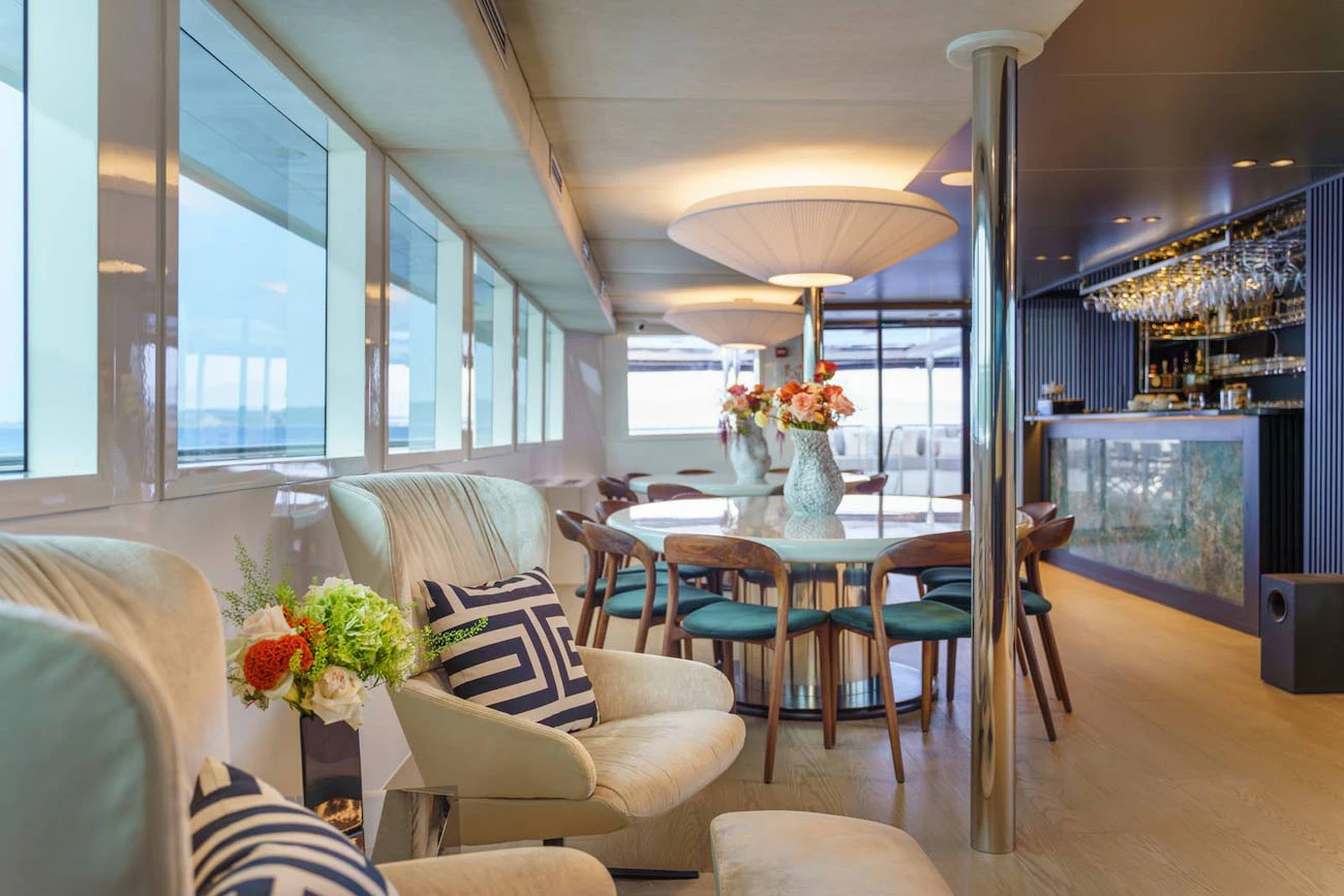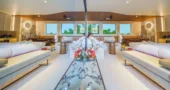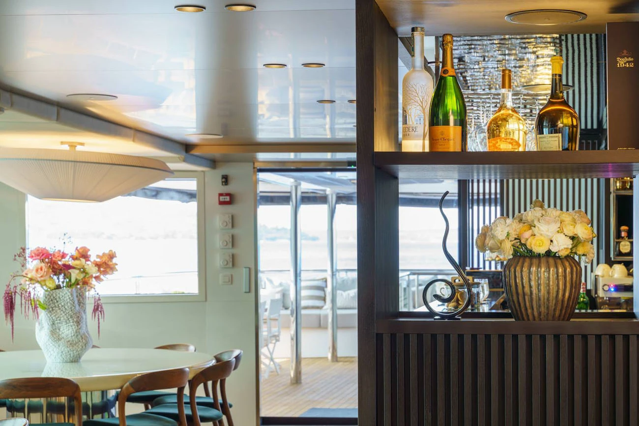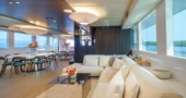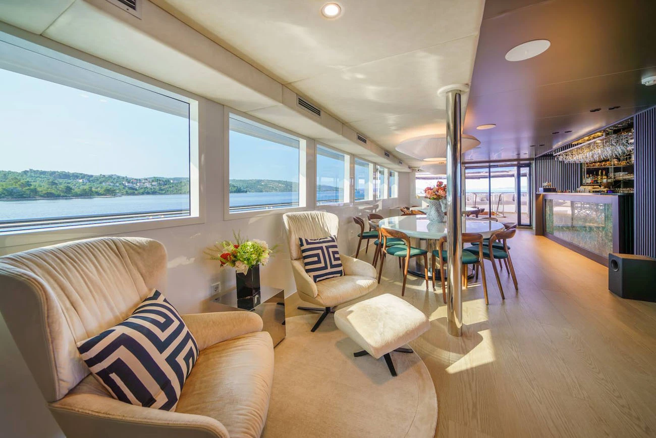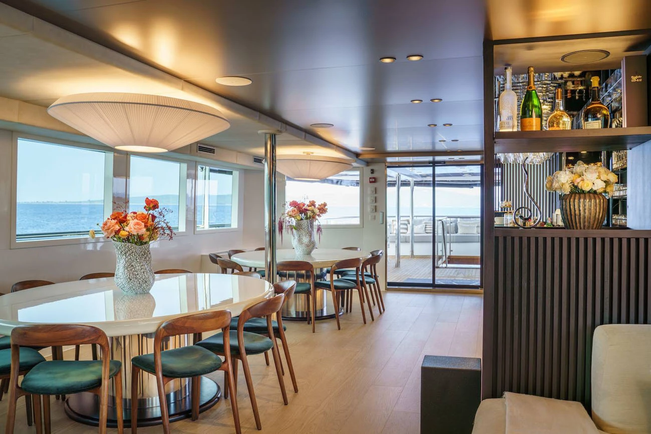 The main saloon serves as the social hub of the yacht, with a spacious lounge, an elegant bar, and two circular dining tables designed for both formal and informal dining.