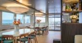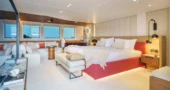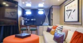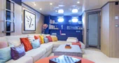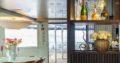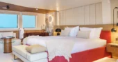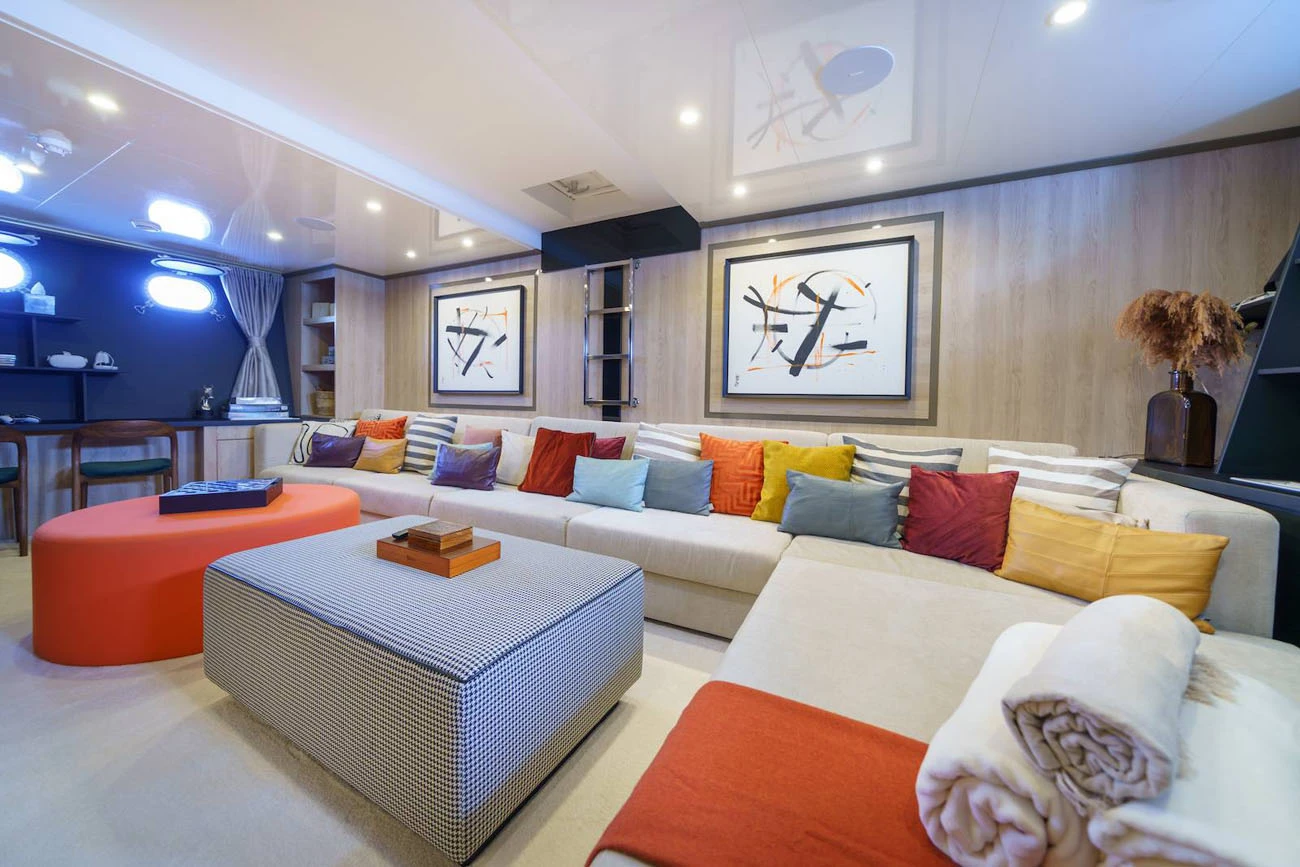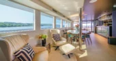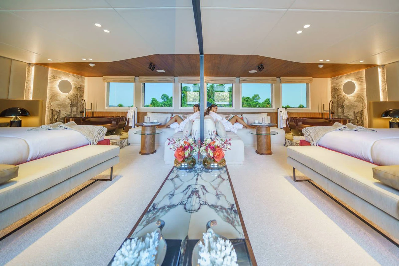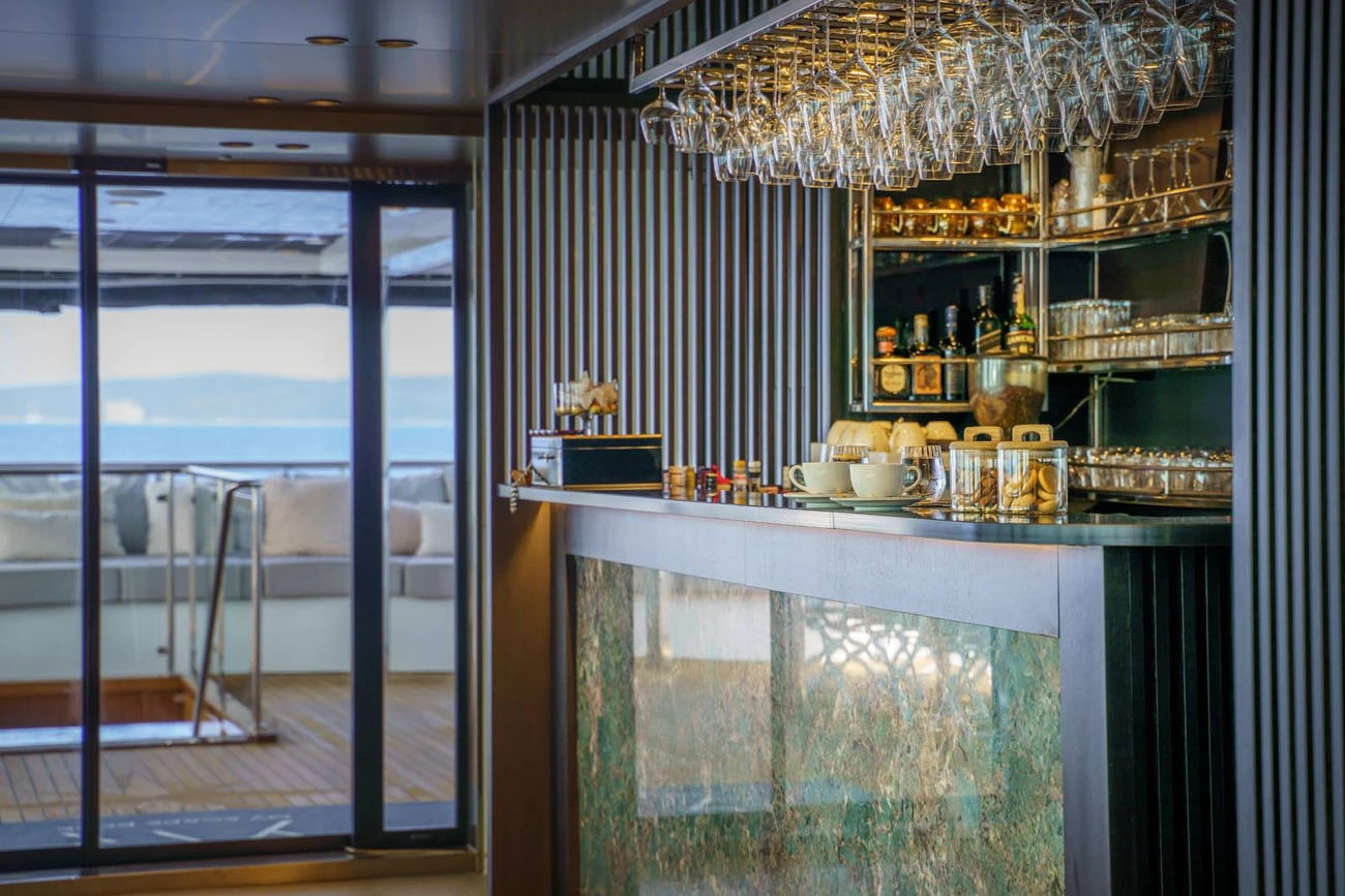 The main saloon serves as the social hub of the yacht, with a spacious lounge, an elegant bar, and two circular dining tables designed for both formal and informal dining.