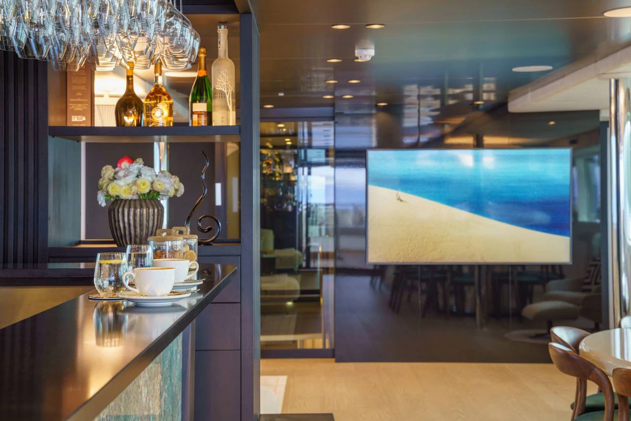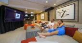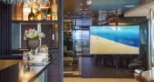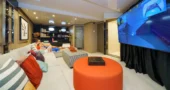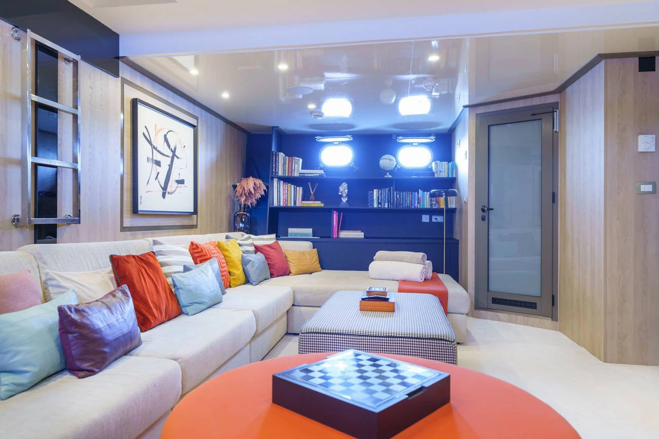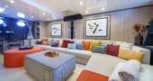 A home cinema room offers a private and immersive entertainment experience. Together with elegant lounges and social areas, the interior design ensures comfort and tranquillity throughout the charter.