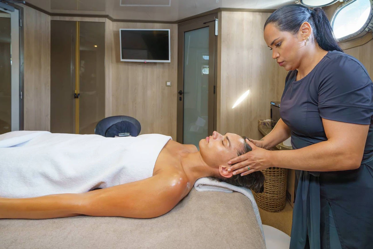 Guests enjoy a fully equipped gym featuring the complete NOHRD luxury fitness range, complemented by a dedicated spa area with sauna. The presence of a professional onboard masseuse and physical therapist, included as part of the crew, further enhances the appeal for wellness-focused charters.