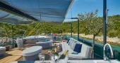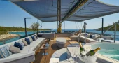 • Sundeck: ampio Jacuzzi circondato da morbidi materassini prendisole, area lounge imbottita, doccia esterna e due zone salotto con tavolini da caffè, elegantemente ombreggiate dagli alberi dello yacht
